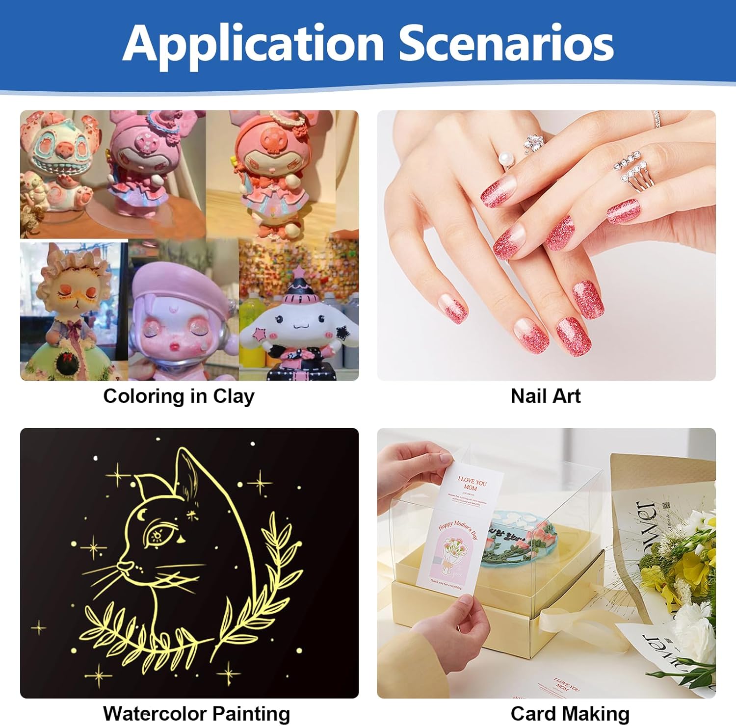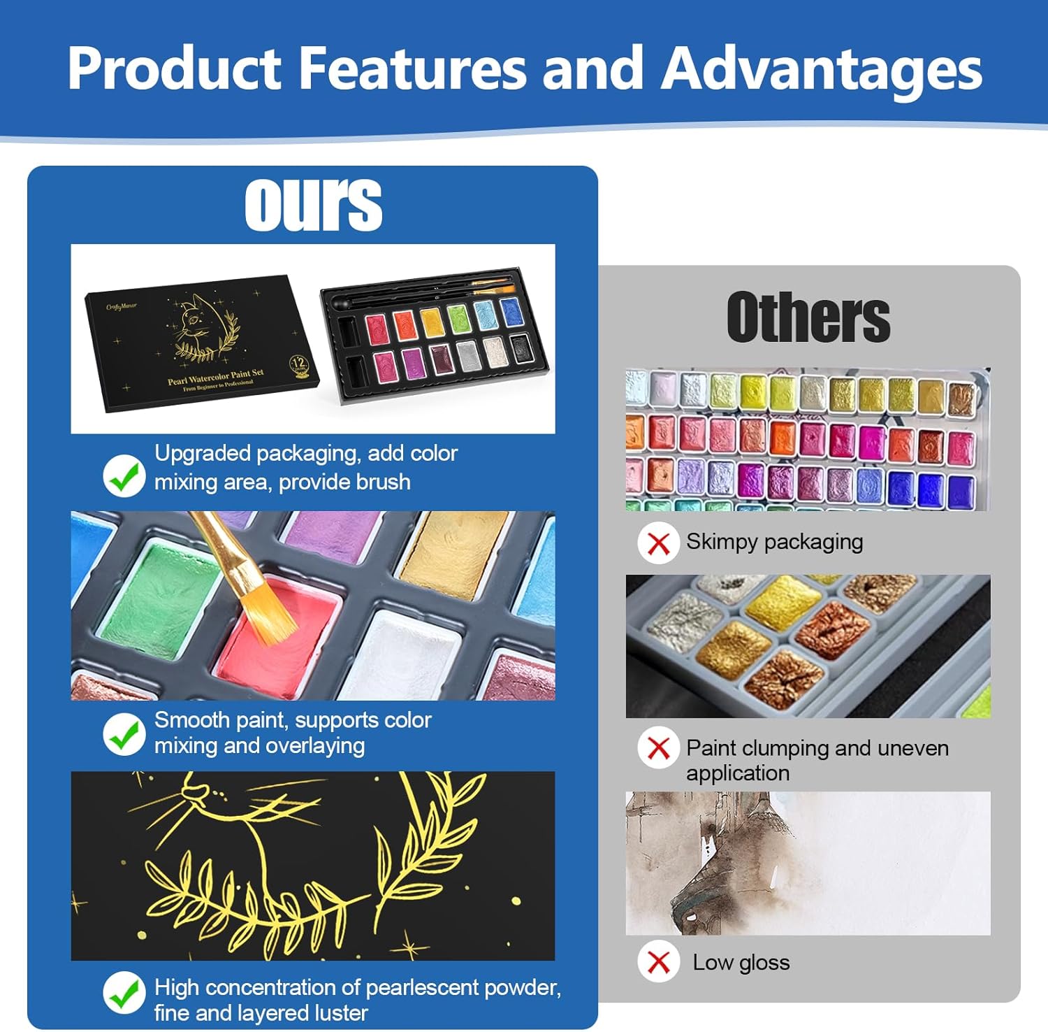 - 【Smooth Strokes, No Powder Off】Our watercolors paint set are extremely durability. Glitter watercolor remain highly stable, drying without crumbling or fading, making the watercolor painting shine forever. The fine powder texture makes the strokes of the pearl paint smooth and resists clumping