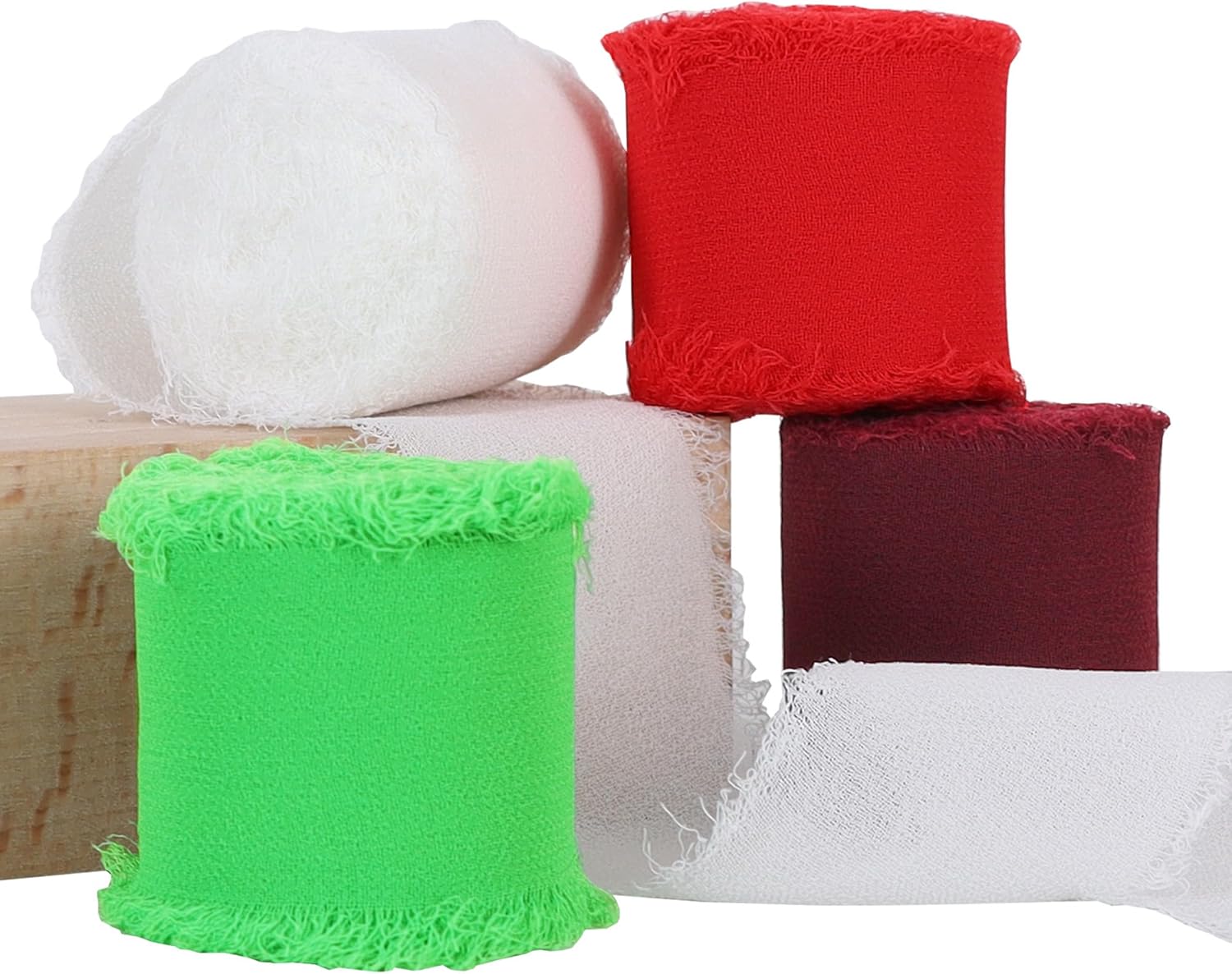 TONIFUL 4 Rolls Silk Chiffon Ribbon 1-1/2 Inch x 22 Yards, Bright Red and Green Handmade Fringe Silk Ribbon Set for Gift Wrapping Flowral Bouquets Crafts Christmas Wreath Elf-Themed Party Decoration