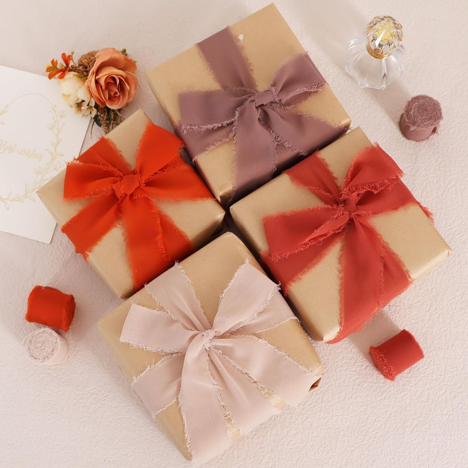 TONIFUL 4 Rolls Silk Chiffon Ribbon 1-1/2 Inch x 22 Yards,Orange Khaki Brown and Rust Handmade Fringe Terracotta Ribbon for Gift Wrapping Bridal Bouquets Crafts Wedding Fall Thanksgiving Decoration