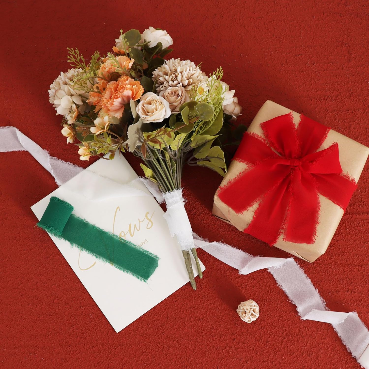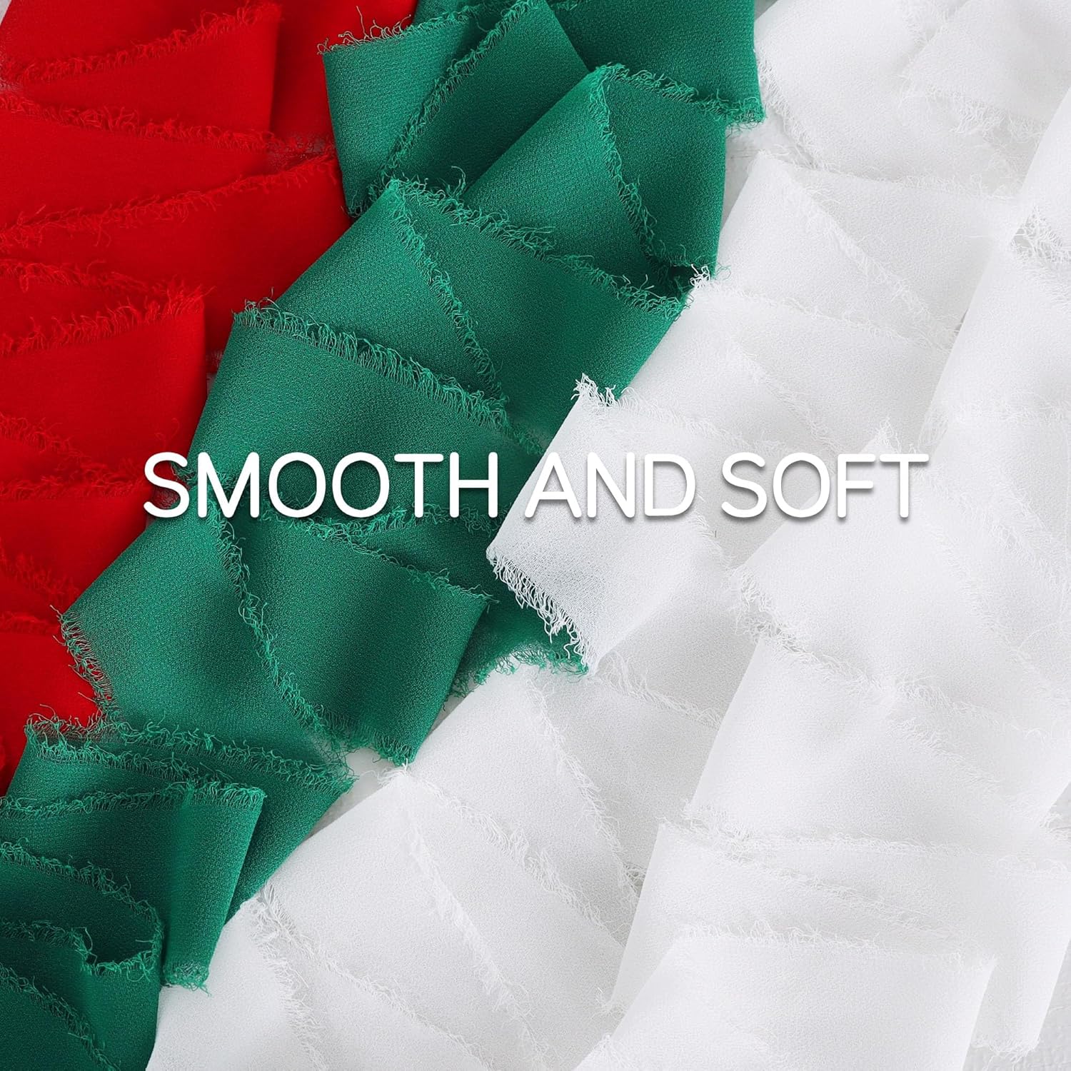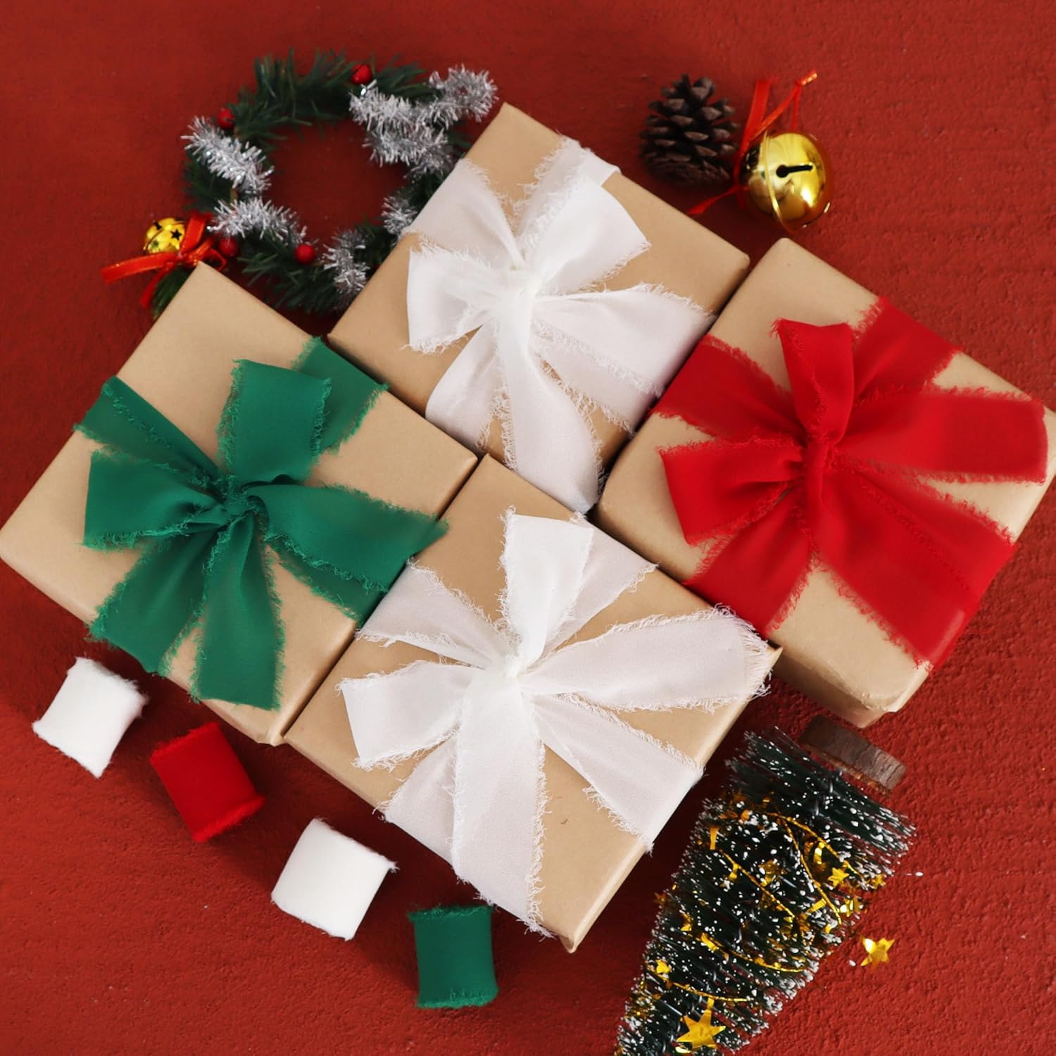 TONIFUL 4 Rolls Silk Chiffon Ribbon 1-1/2 Inch x 22 Yards, Red Green White Handmade Fringe Silk Ribbon for Gift Wrapping Flowral Bouquets Crafts Halloween Christmas Wreath Tree and Party Decoration