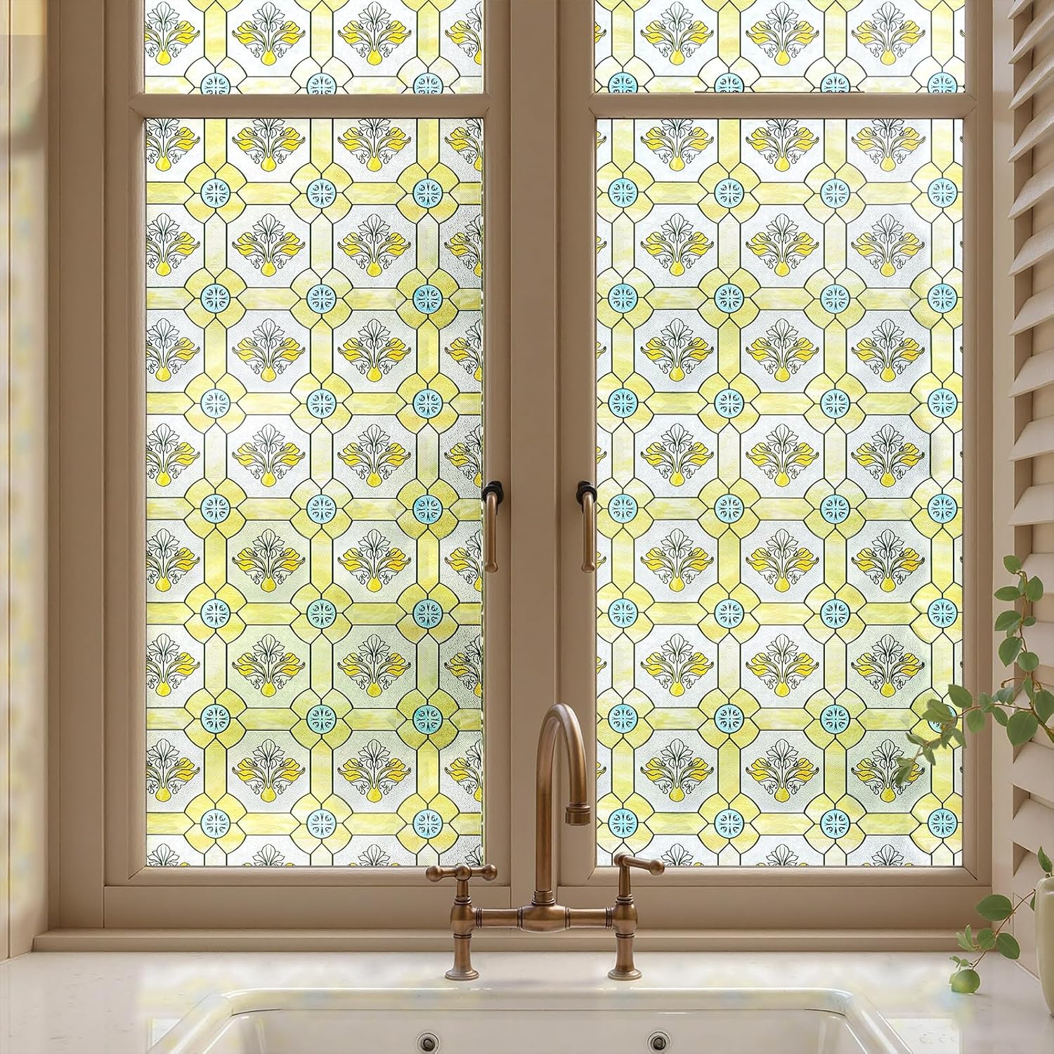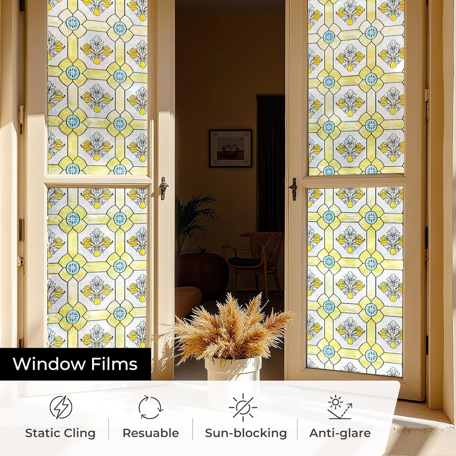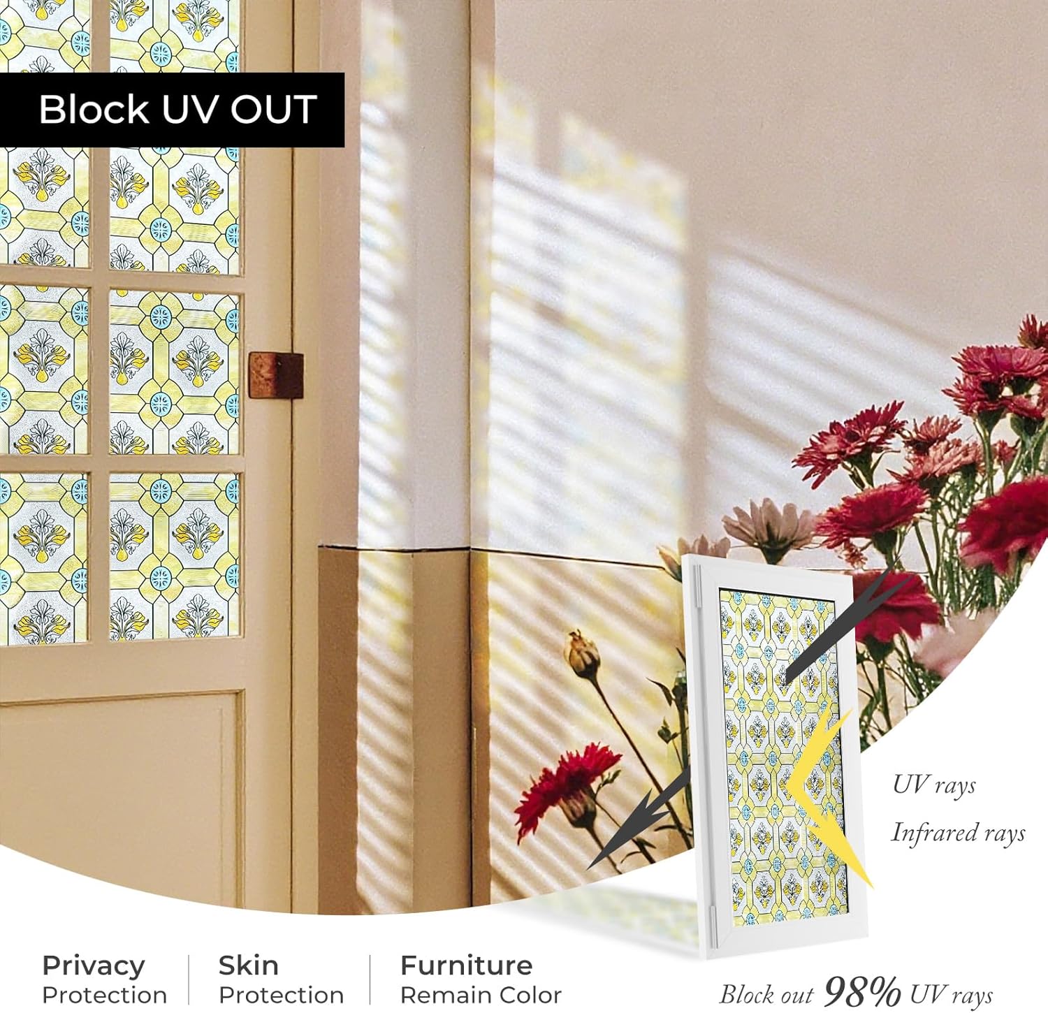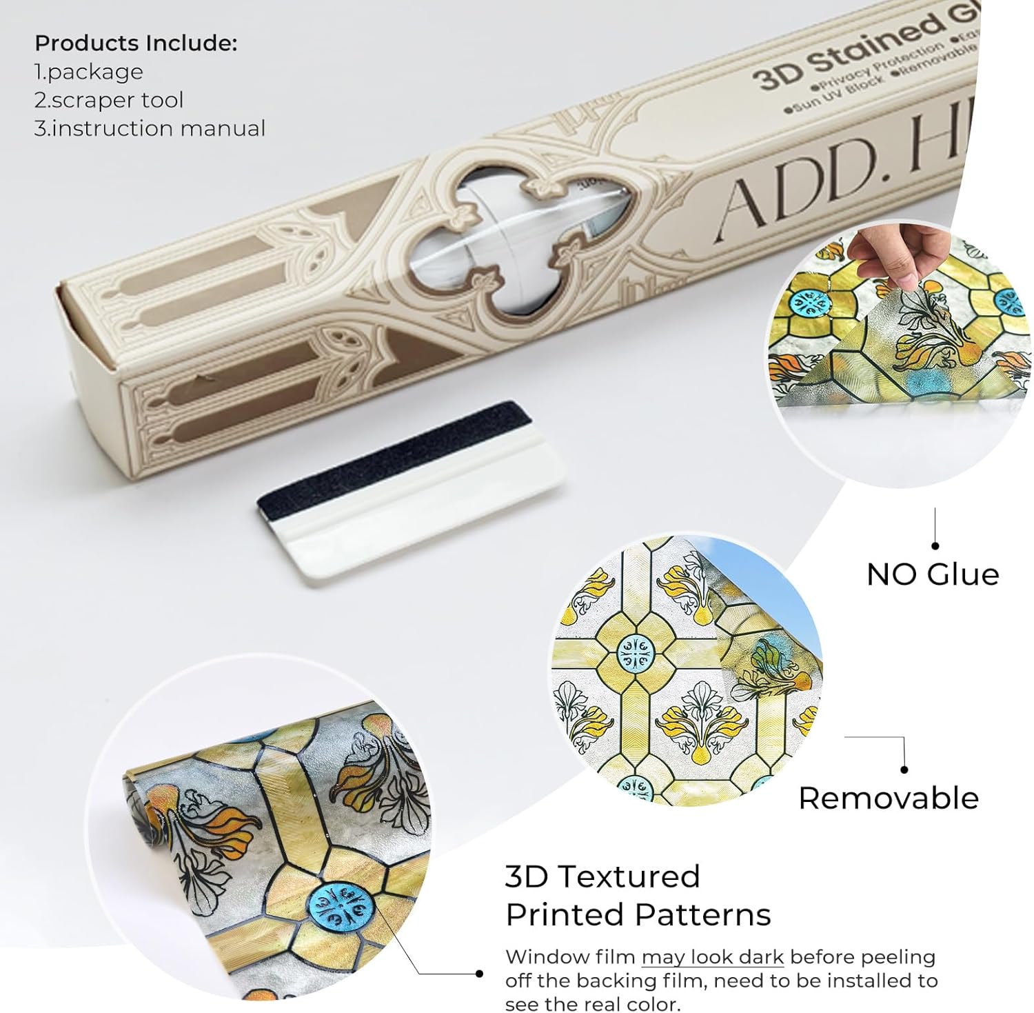 - Easy Installation and Adhesive-Free - Our stain glass film installs easily, no glue needed. Just measure, cut, and apply with water on clean glass. It's residue-free for easy repositioning or removal whenever you want a new look.