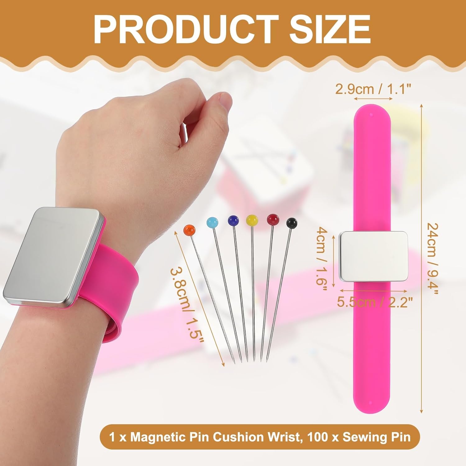 - Specification: Color: Rose Red; Material: Silicone, Magnet; Wrist Size: 24 x 2.9 cm/ 9.4 x 1.1 inch (L*W); Pin Cushion: 5.5 x 4 cm/ 2.2 x 1.6 inch (L*W); Sewing Pins Length: 3.8 cm/ 1.5 inch; Packing List: 1 x Magnetic Wrist Pin Cushions for Sewing, 100 x Sewing Pin