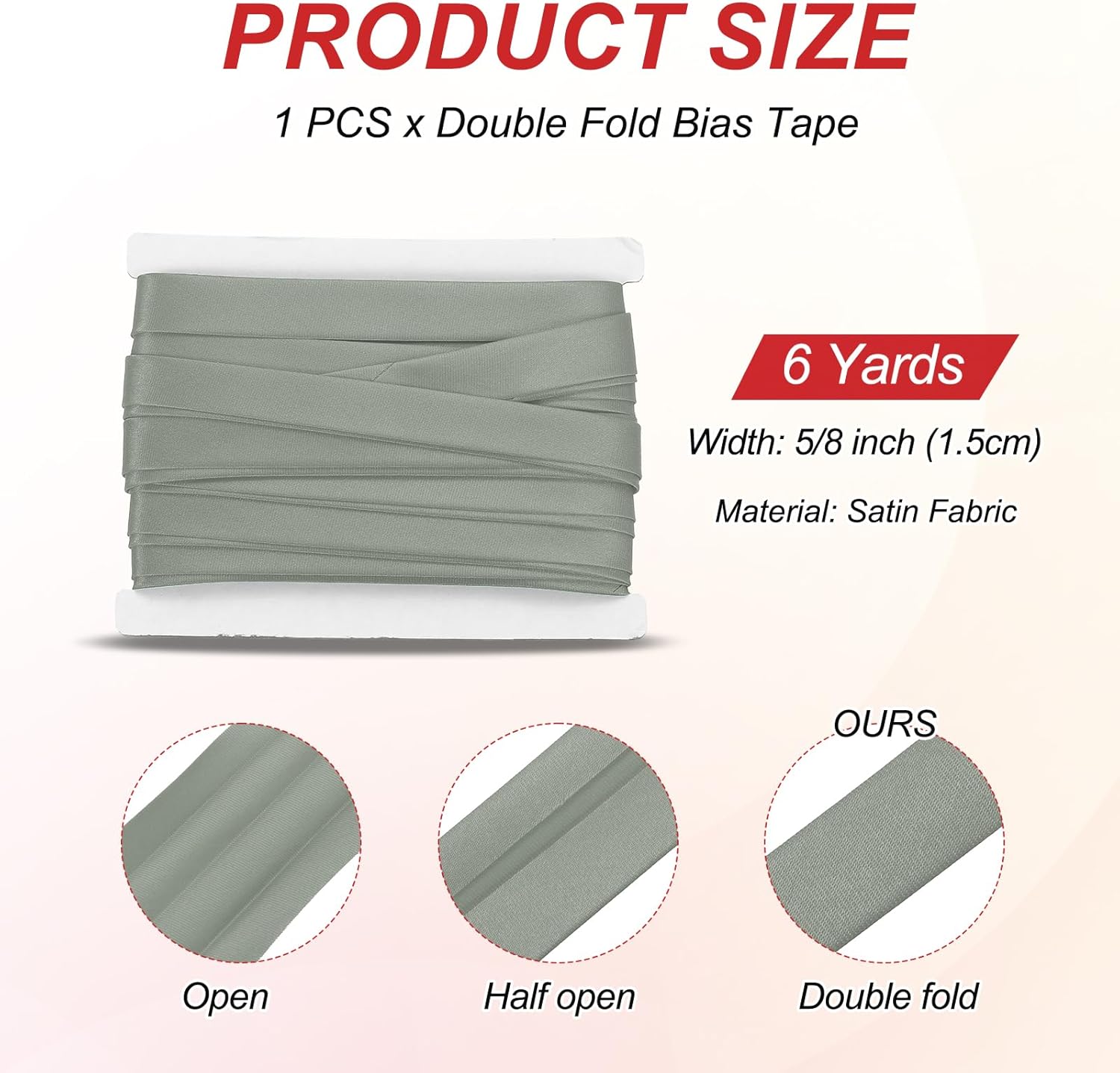 - Package contains: 1 x Double Fold Bias Tape; Width: 5/8 inch (1.5cm); Length: 6 Yards; Color: Gray; Material: Satin Fabric