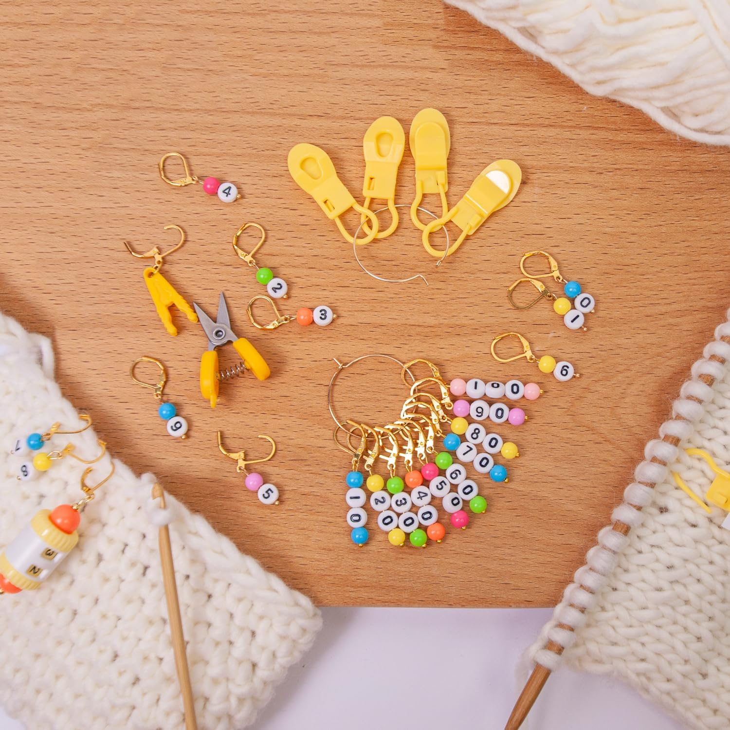 - PACKAGE INCLUDES:9pcs number stitch markers with numbers 0-9,10pcs number stitch markers with numbers 10-100,5pcs clip stitch markers,1pc mini scissors,1pc rotation counter,and 1pc storage bag.This thoughtfully curated set is designed to make your knitting experience effortlessly smooth.
