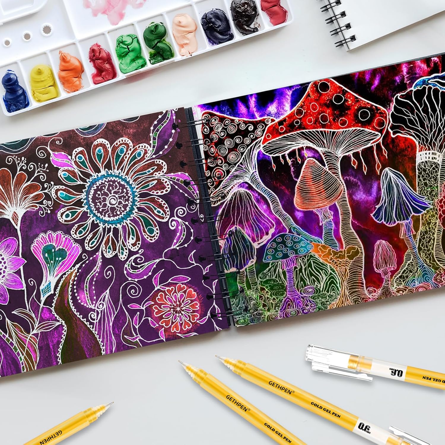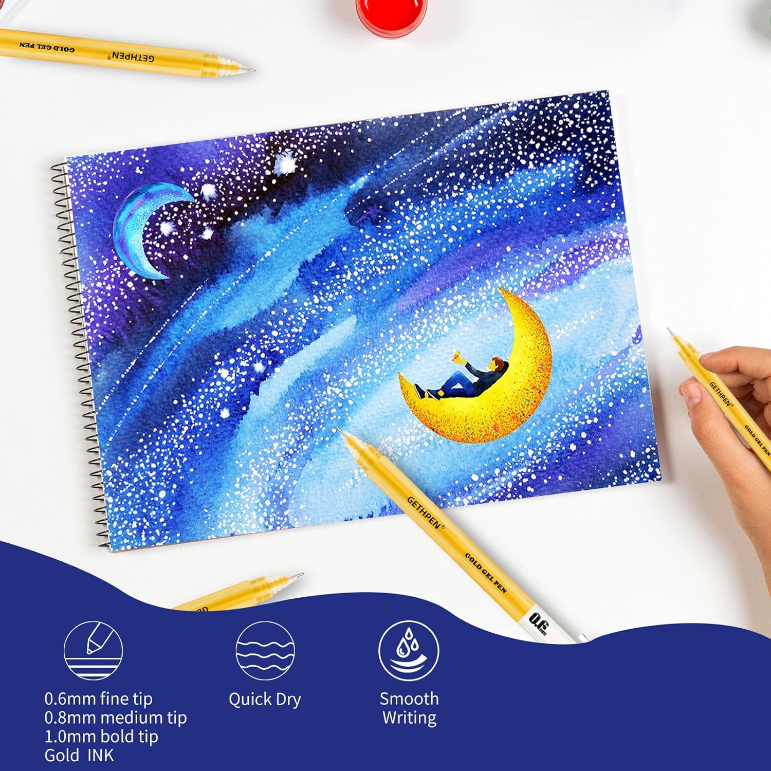 - Gold Gel Pens for Art: Elevate your creations with three premium tips: 0.6mm for delicate bullet journaling, 0.8mm for smooth writing, and 1.0mm for bold art accents. The opaque gold ink adds a touch of elegance to dark papers, perfect for holiday cards or sketch embellishments