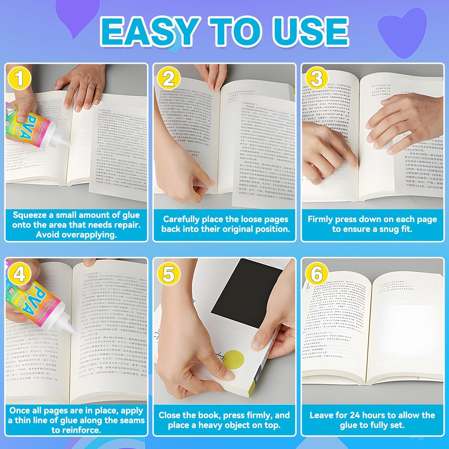 - Easy to Use β Apply a small amount of book glue binding repair to the repair area without overapplying. Press the loose pages back in place firmly, then run a thin line of glue along the seams for extra strength. Close the book, press it down with a heavy object, and let it set for 24 hours. This pH-neutral archival glue is water-soluble and can be diluted with water to adjust drying time as needed
