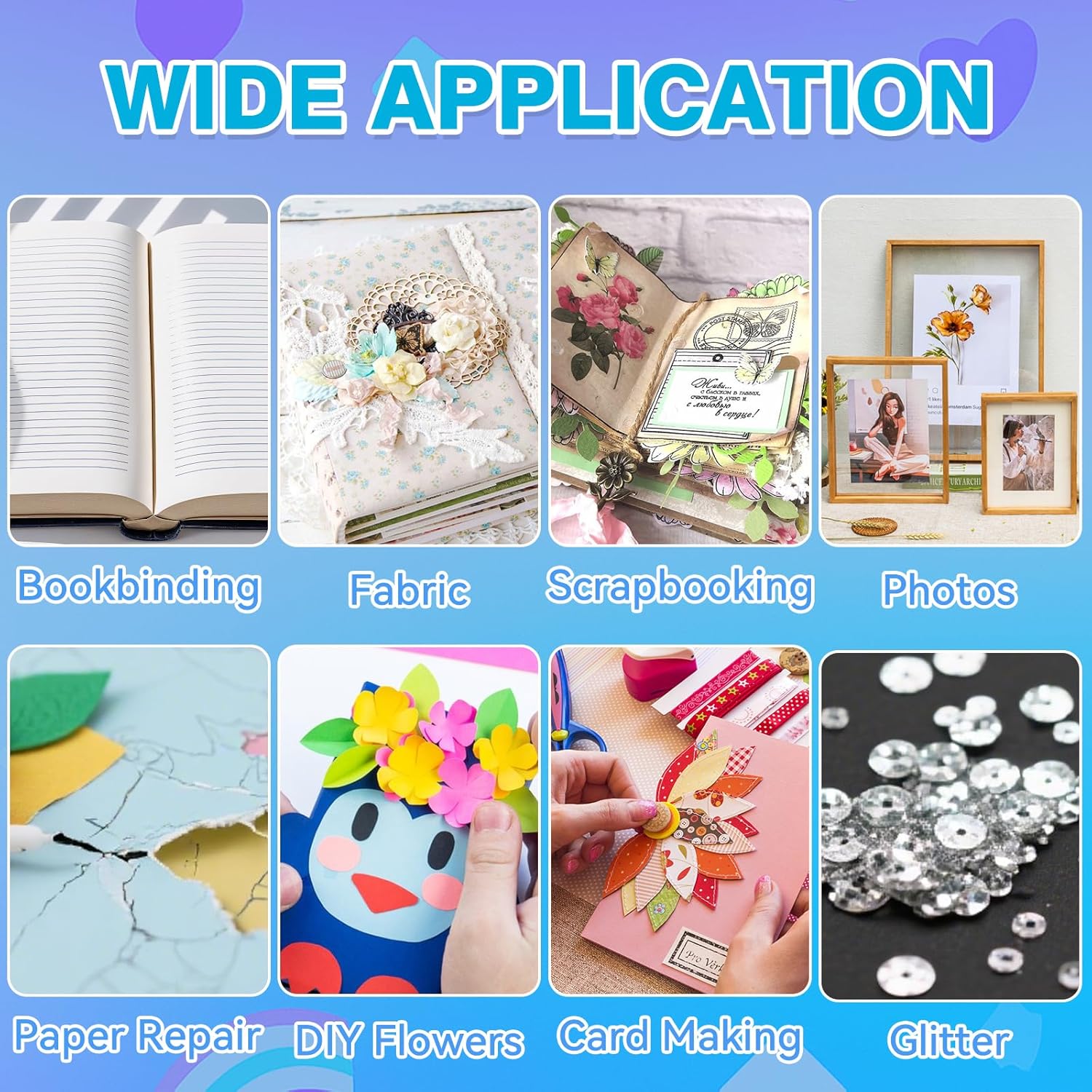 - Wide Range of Applications β This bookbinding glue is suitable for books, paper, cardstock, craft paper, kraft paper, and more. Book binding glues is ideal for bookbinding, scrapbooking, fabric, DIY flowers, paper repair, card making, photos, glitter, and various arts and crafts projects
