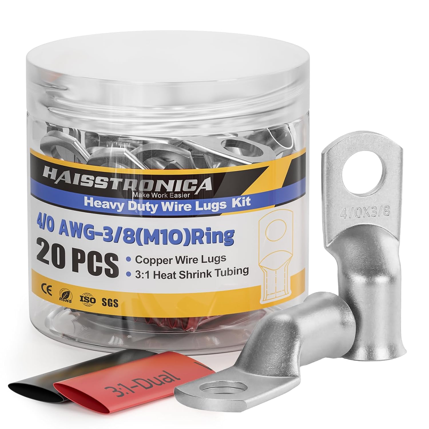 haisstronica 10pcs 4/0 AWG - 3/8"(M10) Tinned Copper Battery Lugs