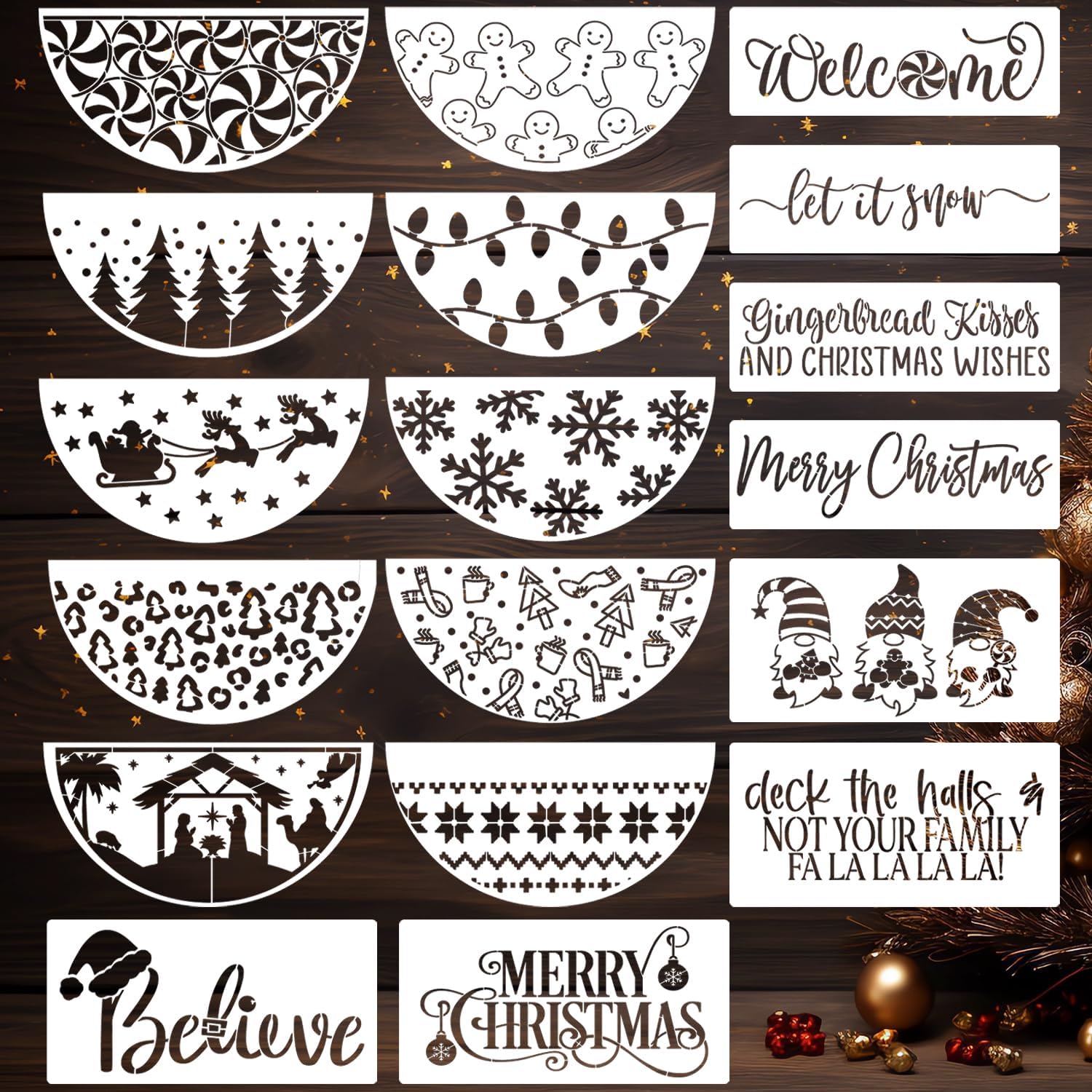 - Christmas Stencils:Exquisite patterns and quotes including let it snow,merry Christmas,gnome,snowflake,welcome with peppermint,gingerbread and pine tree are great for your holiday decor.