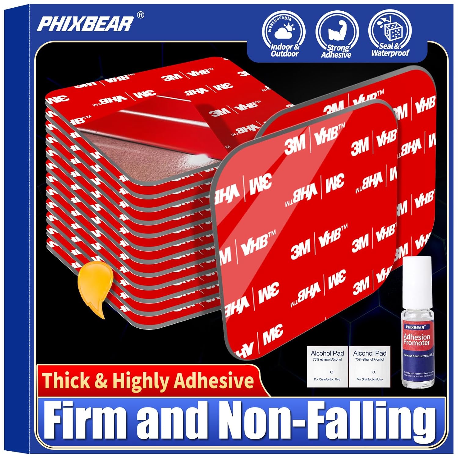 - ABUNDANT QUANTITY:Contains 12 pieces of 3M VHB Strong adhesive double-sided tape, Square 2.36x2.36 Inch, to meet your wider use. And a bottle of adhesion promoter and two alcohol pads.