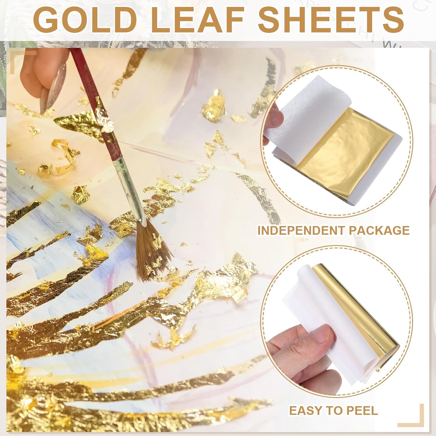 - Independent Packaging: Each gold foil sheet is individually wrapped between thin paper layers for convenient cutting and minimal waste. Simply lift the paper to access the gold foil paper and apply it on various surfaces like canvas, paper, wood, plaster, glass, metal, and cardboard to achieve a shiny texture effect.