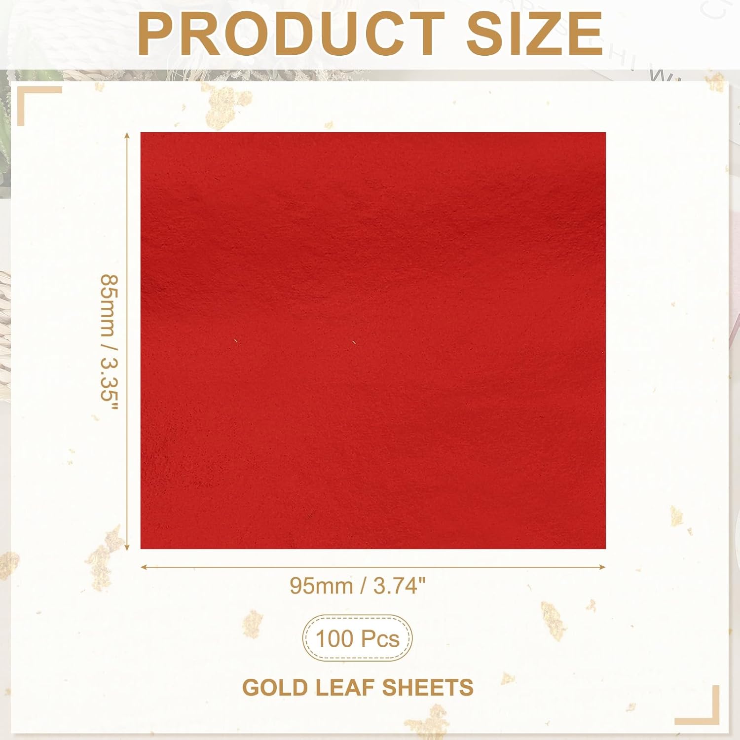 - Color: Red; Total Size: 95 x 85 mm / 3.74 x 3.35 inch (LxW); Package List: 100 Pcs x Gold Leaf Sheets