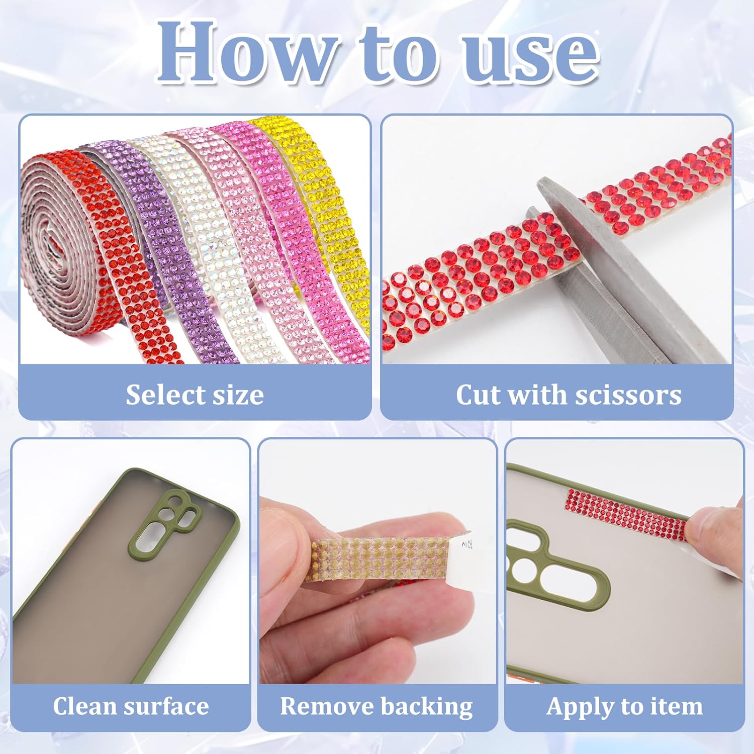 - 【Easy to Use for Crafting】The Rhinestone Ribbon Self Adhesive is easy to use. Simply peel off the backing paper and press the strip onto your desired surface. The high-viscosity adhesive ensures a strong bond, and the strips can be trimmed to any shape or length. Avoid washing decorated items within 48 hours to ensure the rhinestones stay in place
