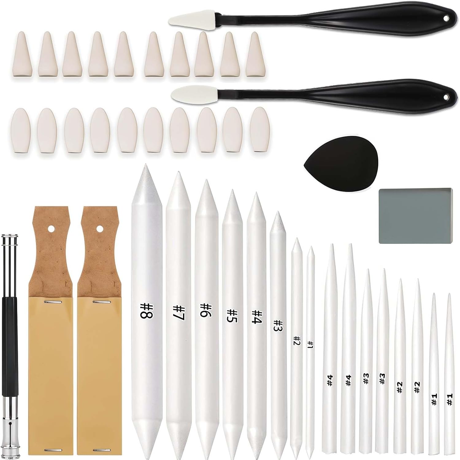 - 【What You Get】8 blending sticks for drawing; 8 drawing erasers for sketching, 2 of each size; 20 sponge replacement tips (10 oval and 10 pointed); 1 sketch eraser sponge; 1 eraser; 1 sandpaper pencil sharpener; 1 pencil extender