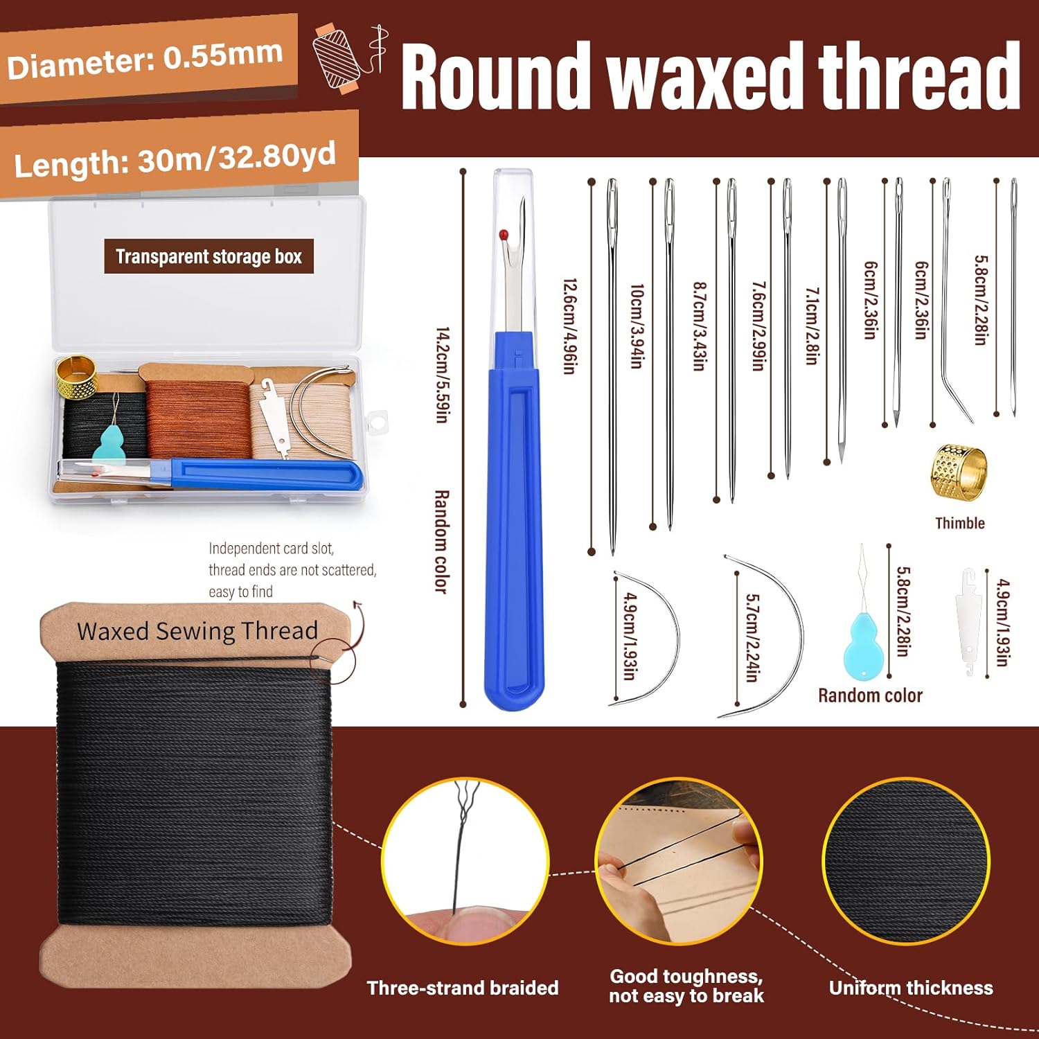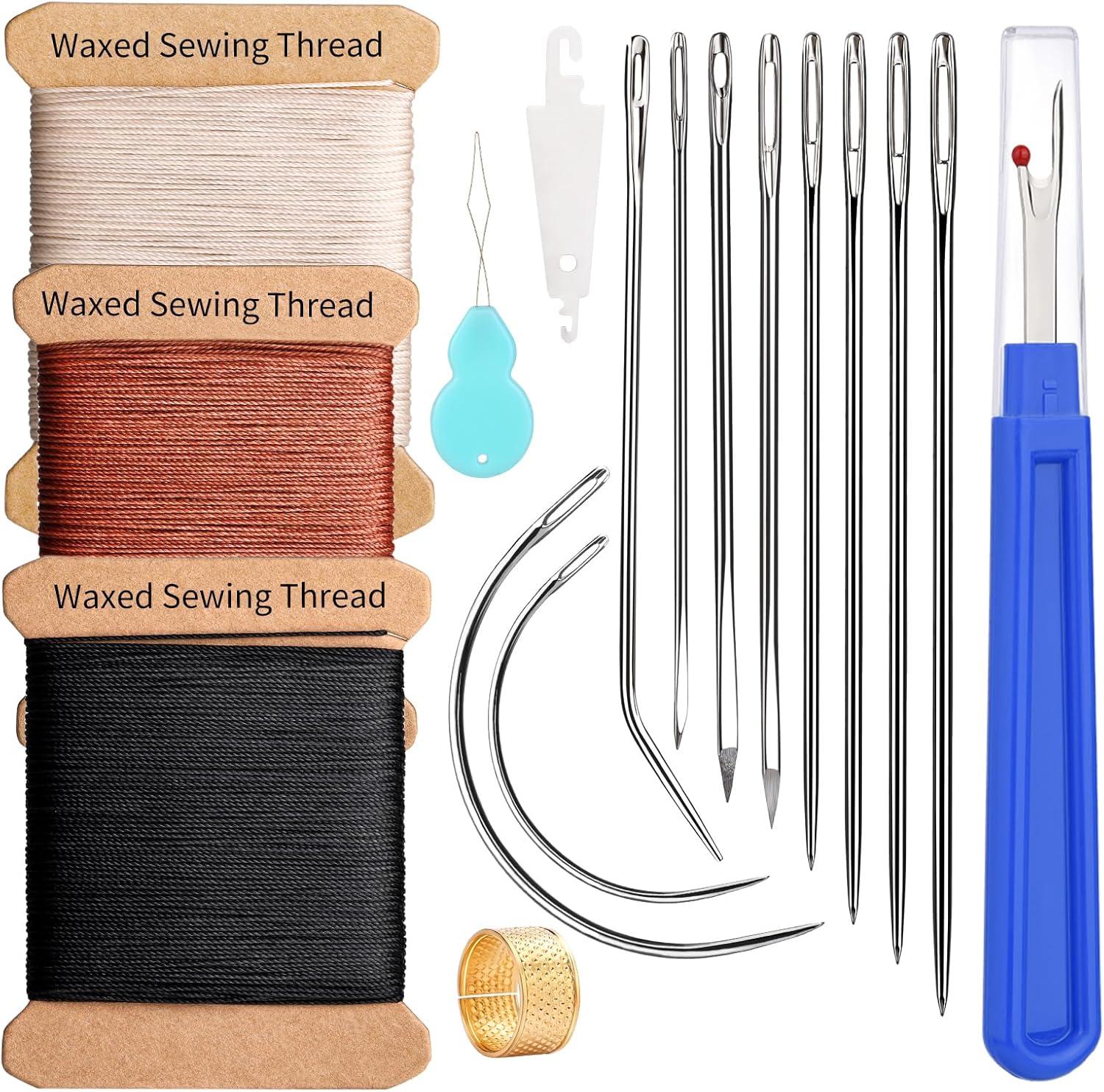 - Leather Needle and Waxed Thread Kit: Upholstery repair kit include 3 rolls 32 yards waxed threads and 8 heavy-duty needles (long upholstery needles, curved needles, j-shaped, triangle leather stitching needle, sail needle), thimbles, threaders, seam ripper. Useful for both beginners and professionals, sufficiently long wax thread and a sufficient number of needles can complete most leather projects