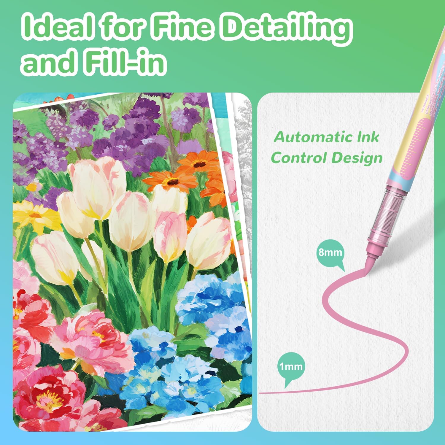 - 【FLEXIBLE BRUSH TIP】The flexible brush tip creates fine lines, bold strokes, and broad fills. One pen handles outlines, smooth coloring, and large graffiti—making every project easier and more creative.