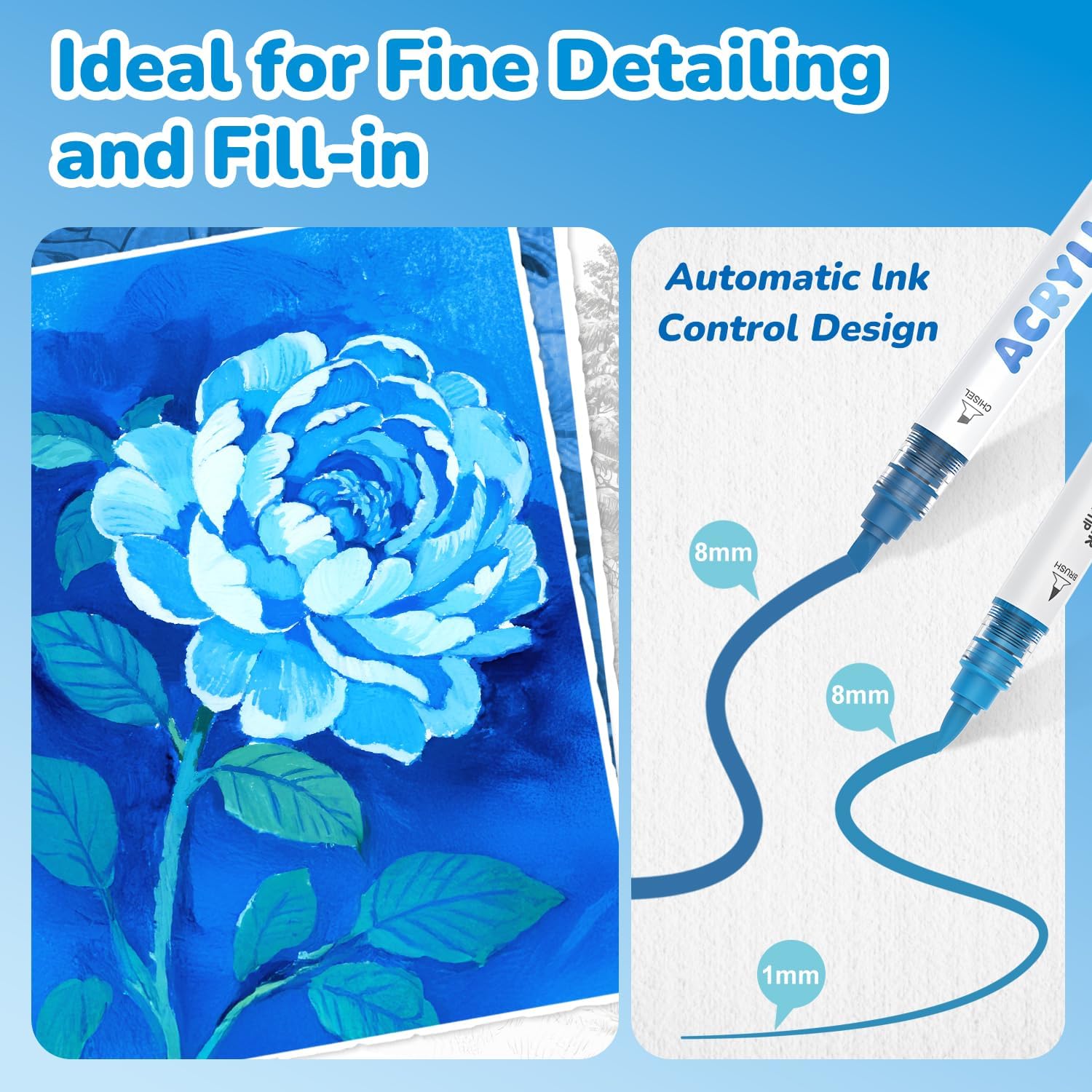 Guangna 12 Blue Dual Tip Acrylic Paint Markers, Brush Tip & Chisel Tip Acrylic Paint Pens for Rock, Wood, Glass, Paper, Coloring Book, Ceramic, Canvas, Water-Based Ink