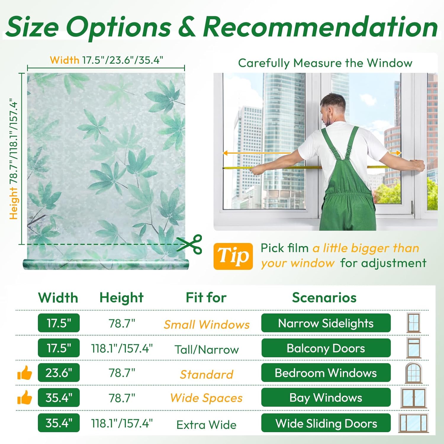 rabbitgoo Rainbow Window Privacy Film Decorative Stained Glass Diamond Pattern Window Sticker with Iridescent Tint Non-Adhesive Static Cling for Home Office Bathroom, Green Leaf 17.5 x78.7 inch