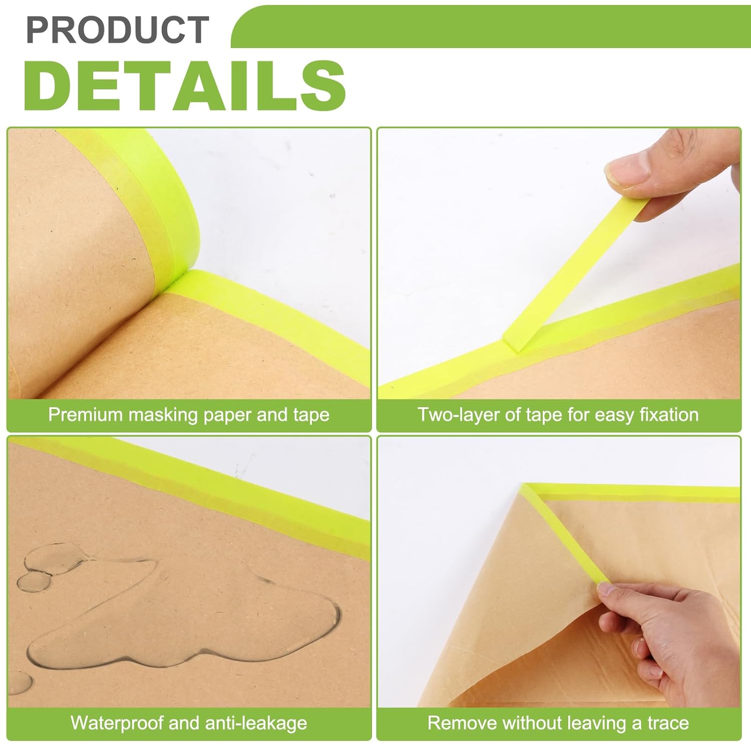 - 【Strong Adhesive & Clean Removal】Automotive paint masking paper is strong and stable, leaves no residue after removal, leaving super sharp lines, no bleed, without sticky residue.compared with most other masking papers on the market, Our masking tape is wider and better adhesionr, masking paper less prone to tearing, better protected,