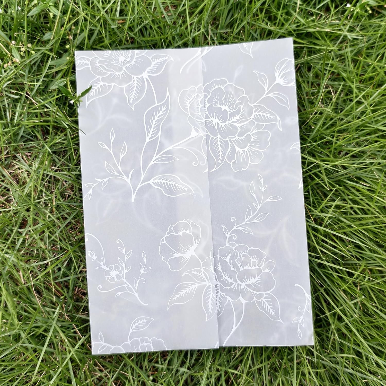 - Elegant Vellum Jackets: These beautiful vellum jackets feature white roses parrten and will add a touch of timeless elegance to your invitations, greeting cards or envelopes