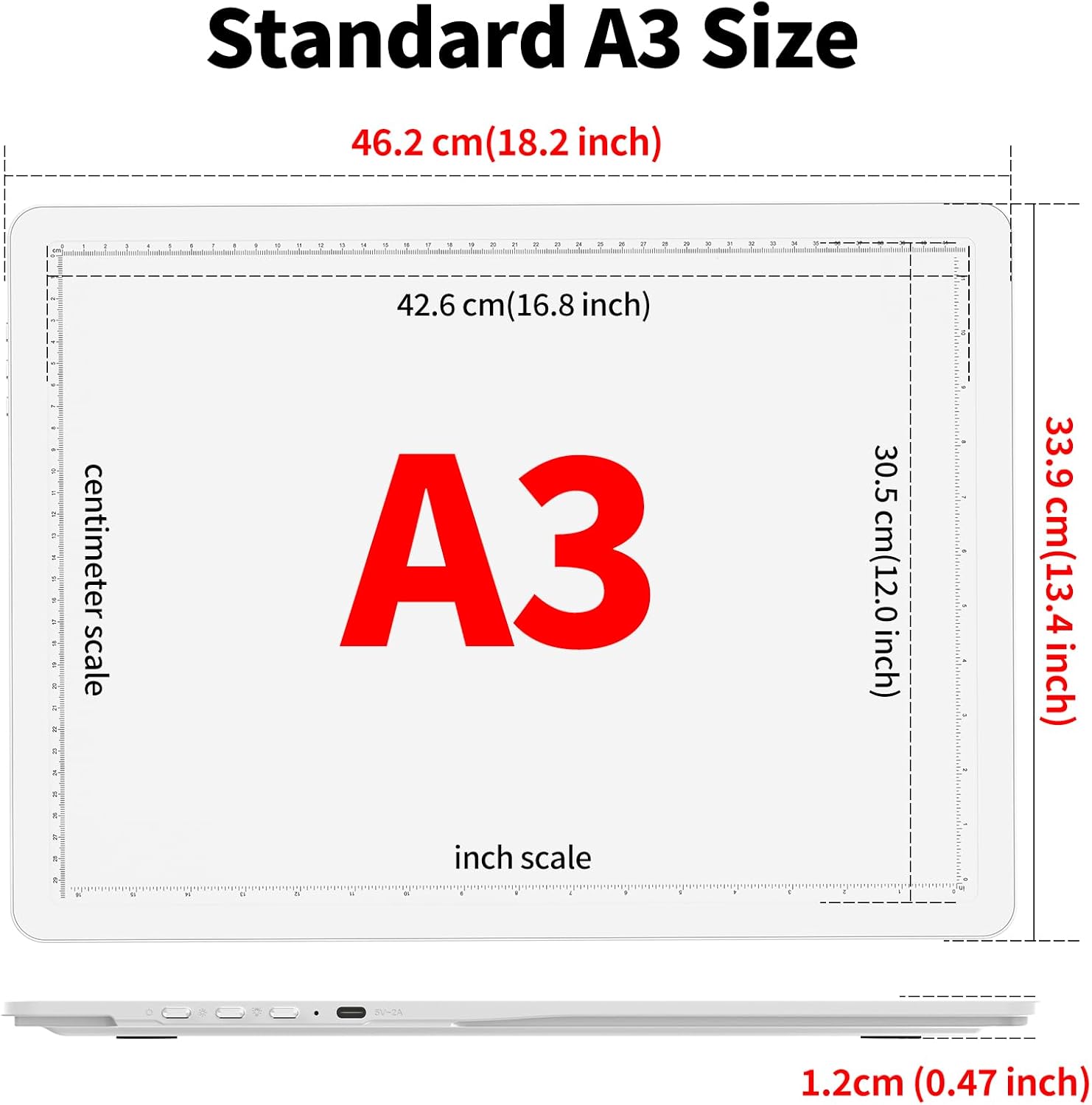 - 【 Standard A3 size, CM-INCH double scale 】 This Rechargeable super bright lightpad Overall Size is 46.2 x33.9 x 1.2 cm ( 18.2 x 13.4 x 0.47 inches ), and the visual working area is 42.6 x 30.5 cm ( 16.8 x 12.0 inches ). Illuminated area large enough for international standard A3 paper. This Light Drawing Sketch Pad has a dual scale of centimeters and inches to meet your various usage habits.