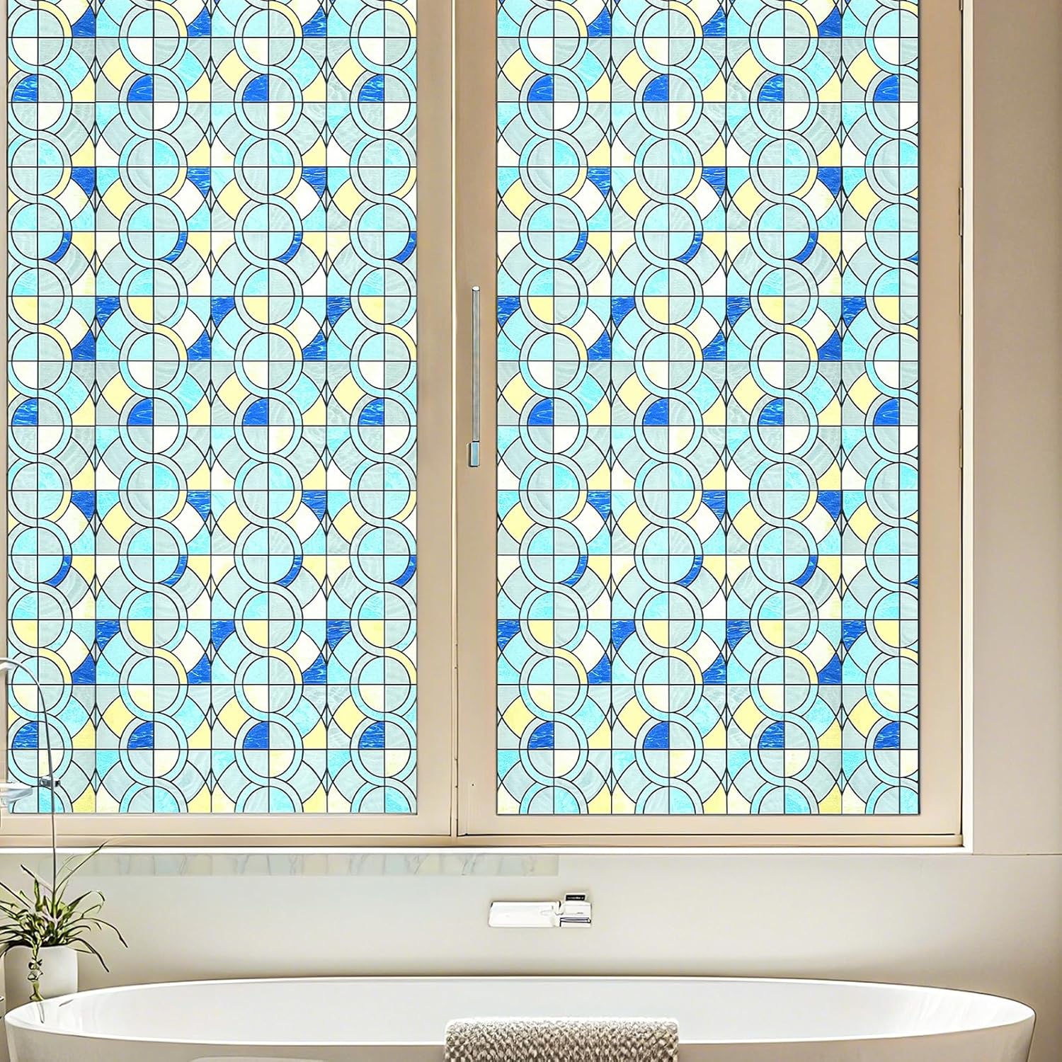 Window Privacy Film, Frosted Glass Decorative Static Cling, Removable Sun Blocking Vinyl Covering, Window Film for Home Kitchen Living Room Bathroom, Geometric Rings, 17.5" x 78.7 "