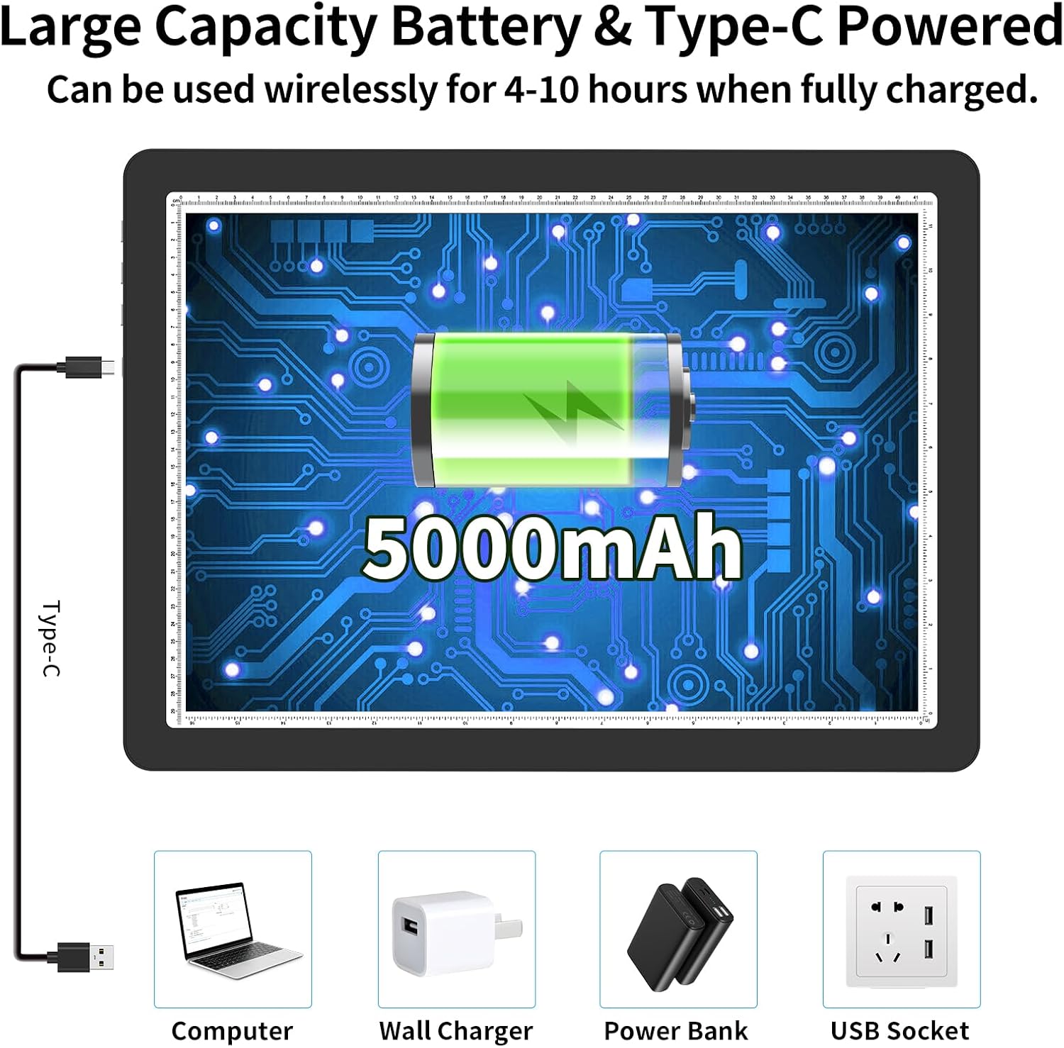 - 【 High Capacity Battery Powered Lightbox 】 With 5000mAh rechargeable lithium battery, the magnetic tracing pad can work continuously for 4-10 hours wirelessly. Convenient for you to use it anywhere in your home or on your journey. Equipped with upgraded fast charging Type C cable, easy to access any Type-C port, charging is fast and efficient. Both battery mode and charging mode are applicable. Also,the USB-C interface is more stable than the Micro interface.