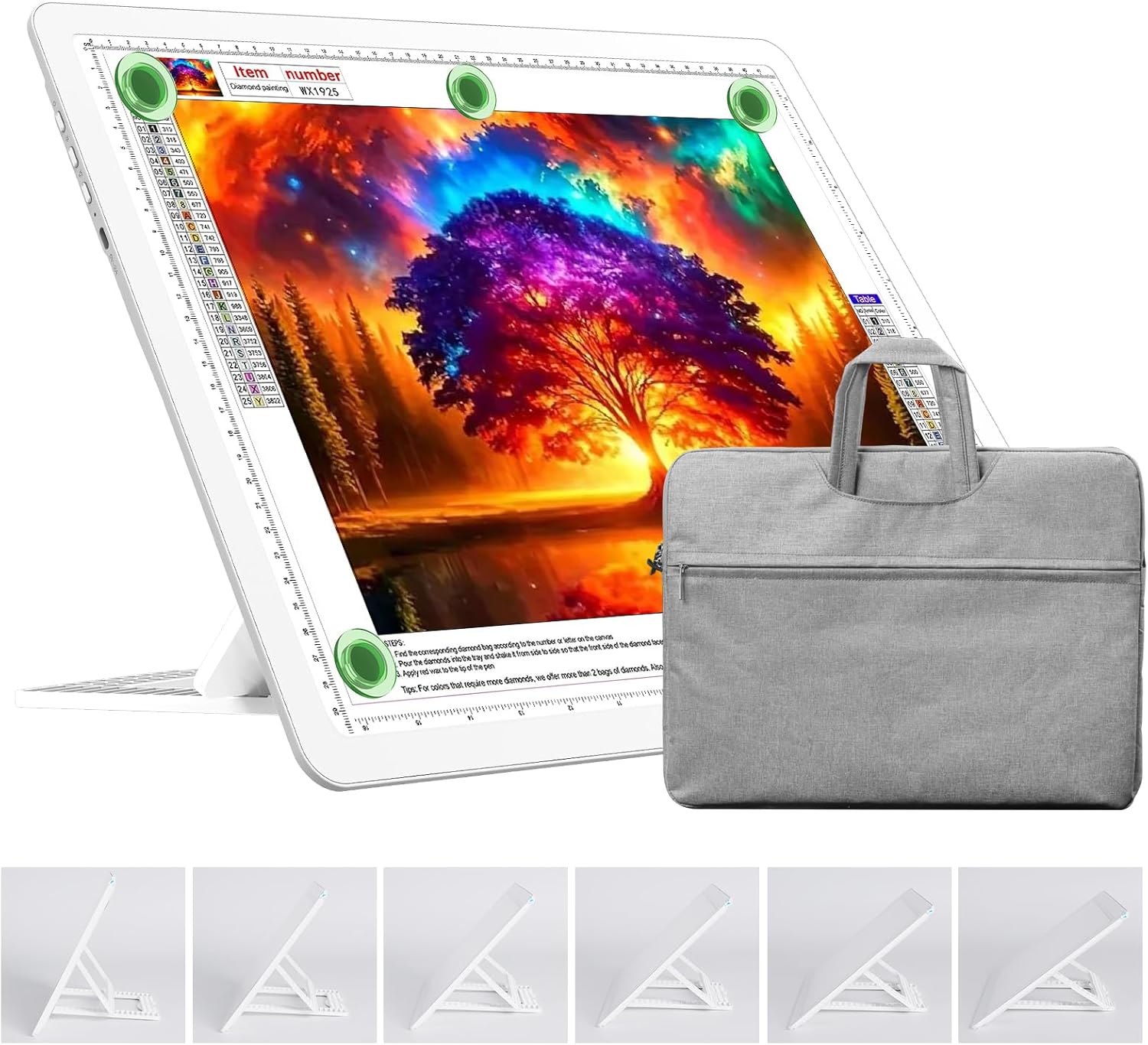 - 【 Upgraded Version with Built-in Foldable Stand Design 】 Built-in Foldable Stand is hidden on the back of the diamond art light board and is adjustable at 12 angles to help you correct your posture and reduce neck,back and eye fatigue. You DON'T have to pay for any extra stand any more. When you are doing diamond painting or weeding vinyl, you can unfold the stand and work in your most comfortable posture, good for health.