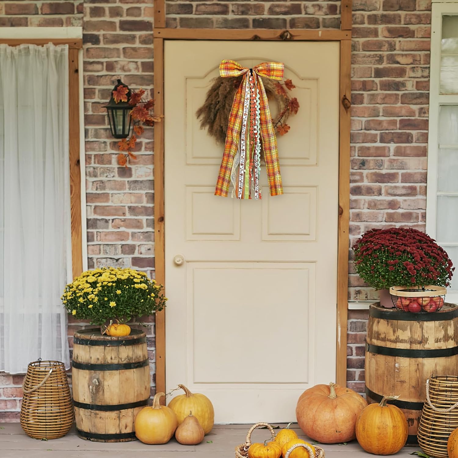 Large Fall Ribbon Bow for Wreath, Orange Buffalo Plaid Fabric Ribbons Set Assorted Lace Ribbon Fall Clip-On Wreath Sash Ribbons Bundle for Thanksgiving Indoor Outdoor Decor