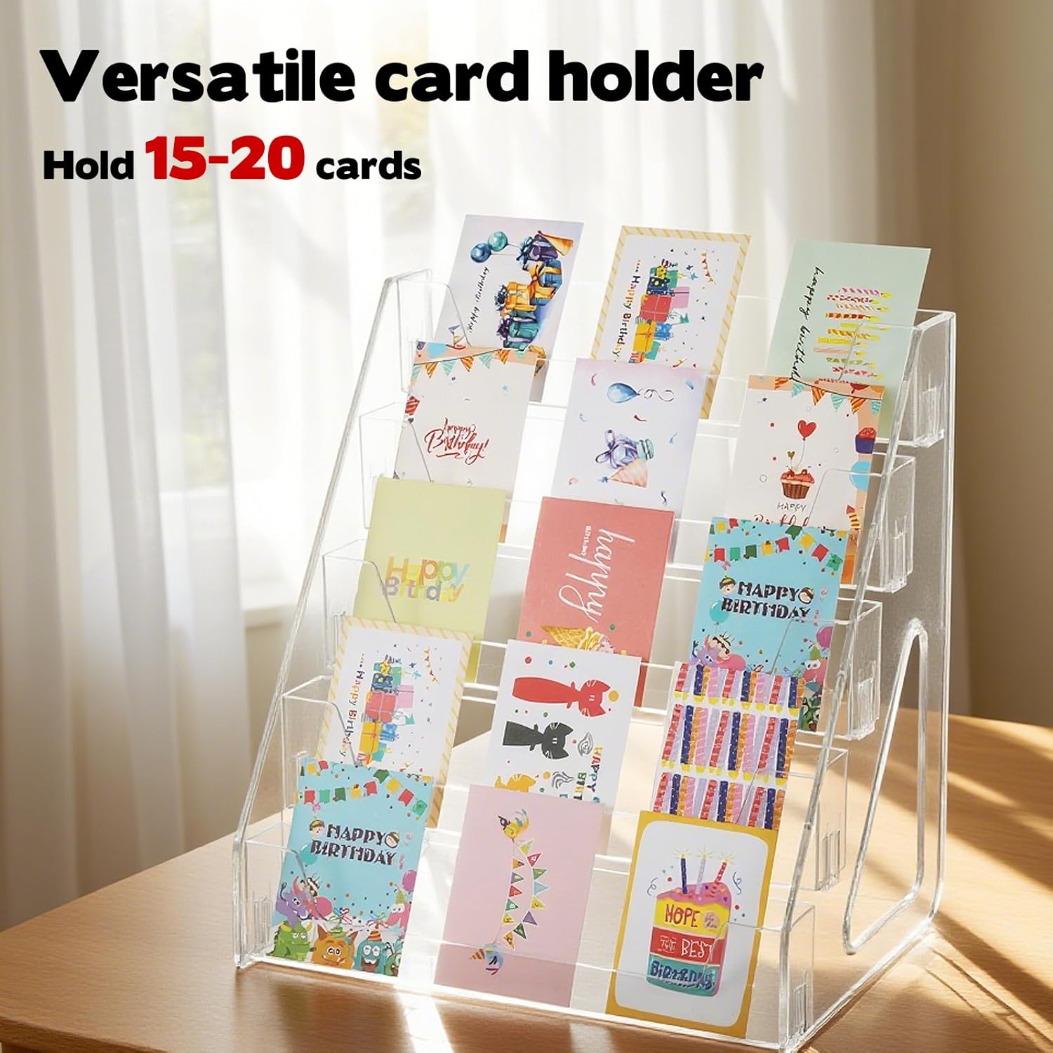 - Spacious Layered Storage: This elevated 5-tier acrylic card display stand measures 12”L x 8.5”W x 13”H, with each tier accommodating up to 4 cards, allowing for the easy display of 20 standard cards. The generous capacity design of the greeting card display stand enables you to showcase more collectibles in limited space, effectively meeting various display needs