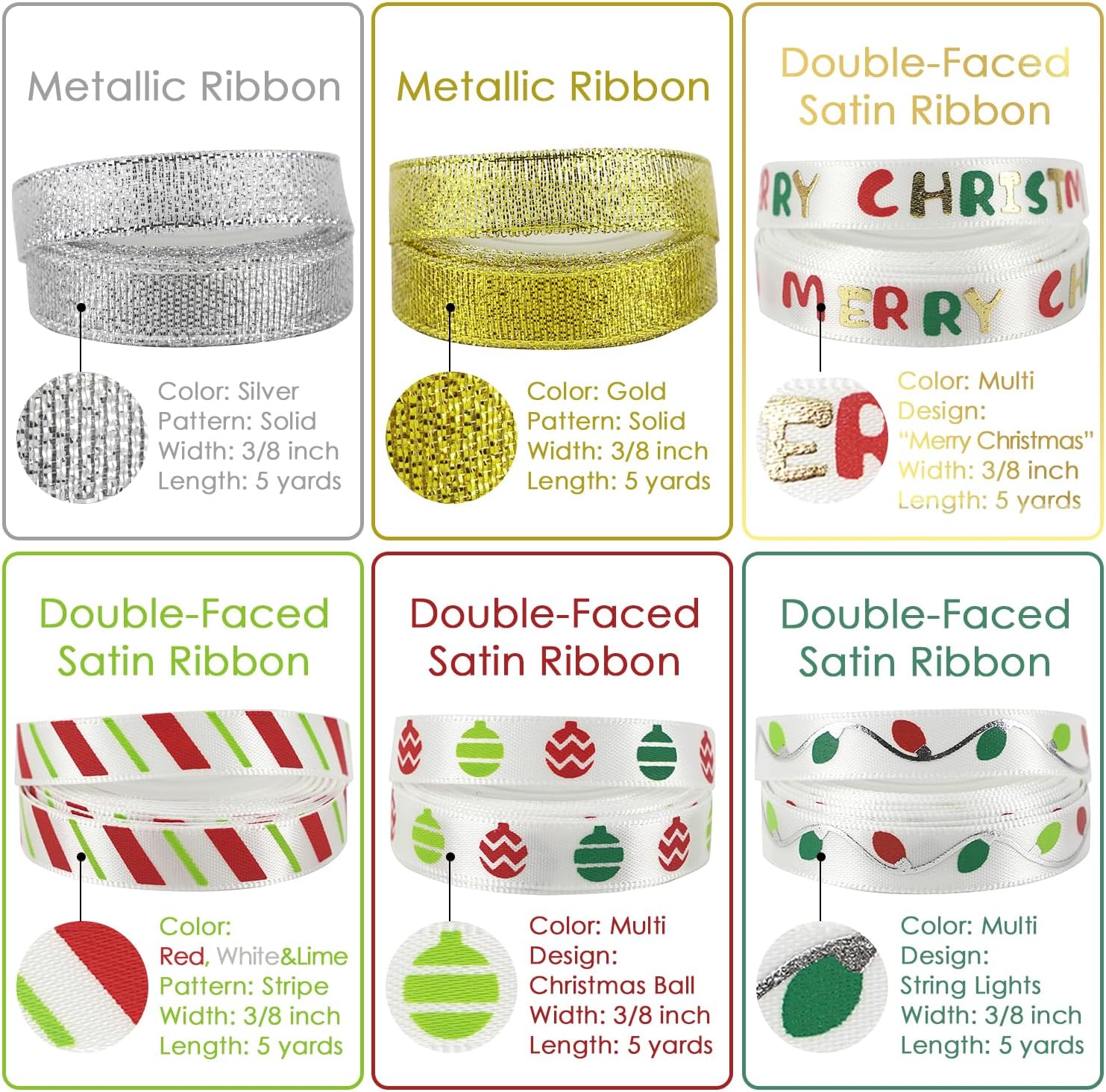 - [ Festive Ribbon Assortment ] This assorted Christmas ribbon pack includes 12 unique designs, each spool measuring 3/8 inch wide and 5 yards long, for a total of 60 yards. Perfect for holiday gift wrapping, bow making, and festive crafts, these ribbons bring variety and charm to every project. From classic solids to playful prints, you'll have the perfect trim for every occasion.