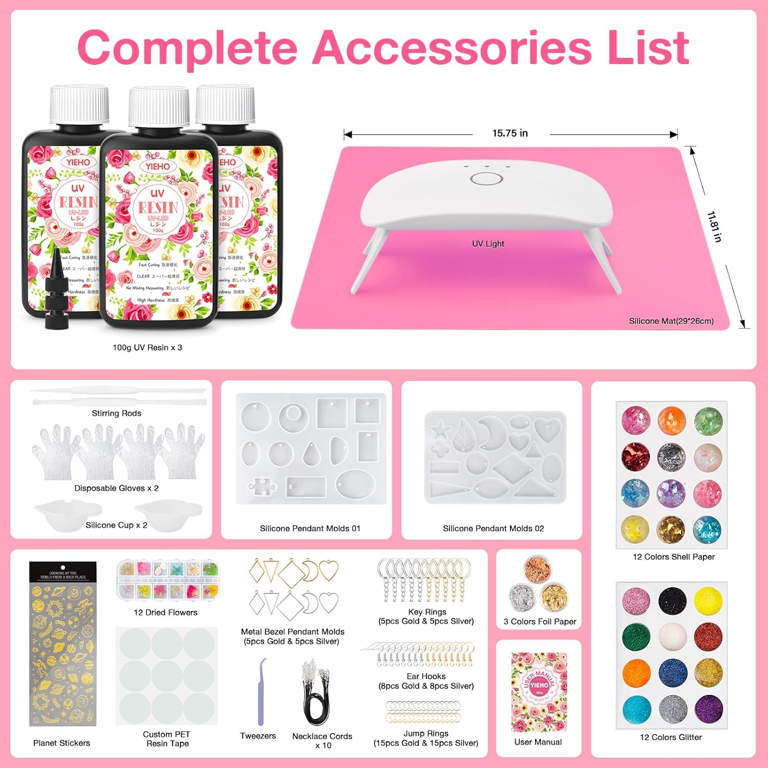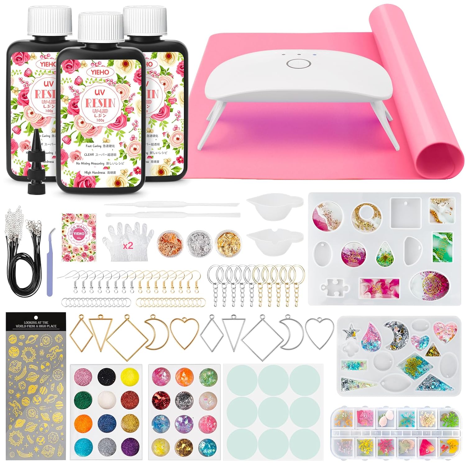 - 【COMPLETE UV RESIN KIT WITH LIGHT and TOOLS】This uv resin jewelry making supplies kit includes 3 bottles of 100g UV resin, a UV light, 2 silicone pendant molds, a silicone mat, 12 kinds of dried pressed flowers, 12 colors glitter, 12 colors glitter flakes, gold foils, planetary stickers, ear hooks, jump rings, key rings, bezel pendants, essential tools like resin tape, silicone cups, stir sticks, tweezers, instruction manual.