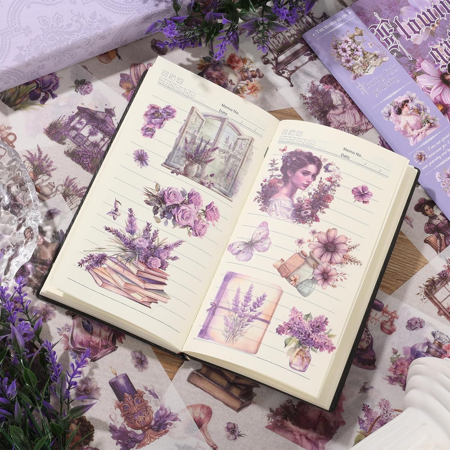- Our vintage scrapbook stickers feature a variety of motifs, including women, girls, purple flowers, plants, flower pots, bicycles, castles, and tables and chairs. Use these stickers to personalize your scrapbook pages. They add color, texture, and visual interest, making your scrapbook look better.