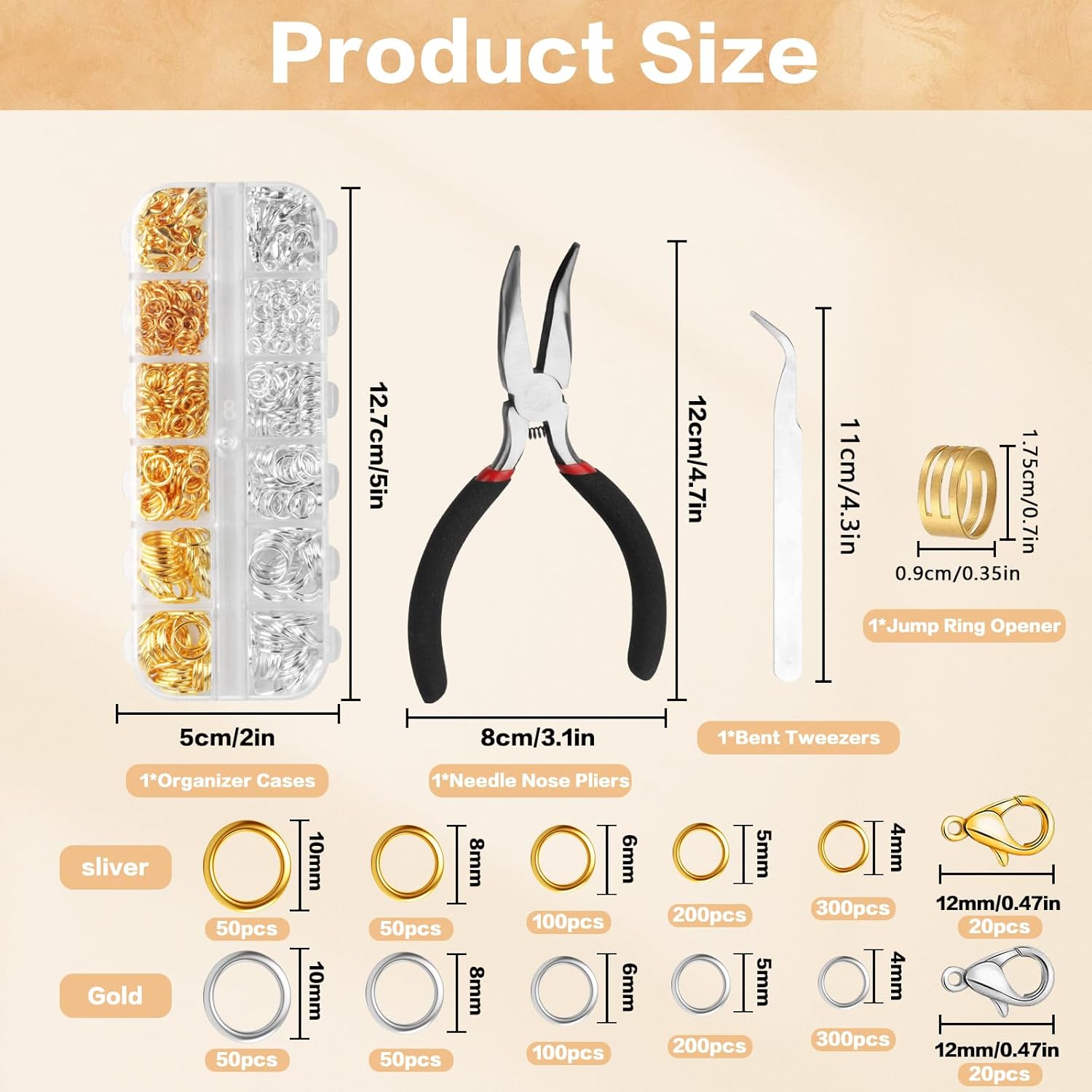 - Package includes: 1440 pieces of jump rings for jewelry making, with a variety of sizes, such as 4mm, 5mm, 6mm, 8mm, 10mm, etc., equipped with bent-nose pliers, tweezers, and jump ring opener, perfect for your craft needs.