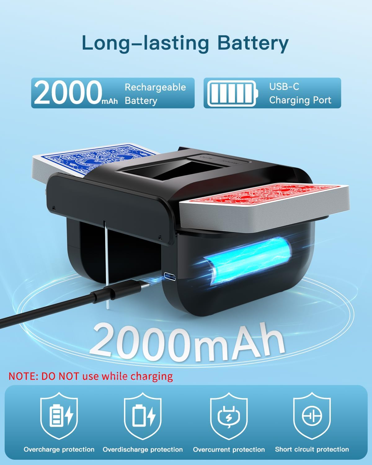- USB-C Rechargeable: With a 2000mAh high-capacity battery, No more frequent battery replacement. The USB-C charging port allows for quick charging and ensures that your card shuffler is always ready for action. So you can enjoy your game night to the fullest. PLEASE NOTE: Does not shuffling while charging.