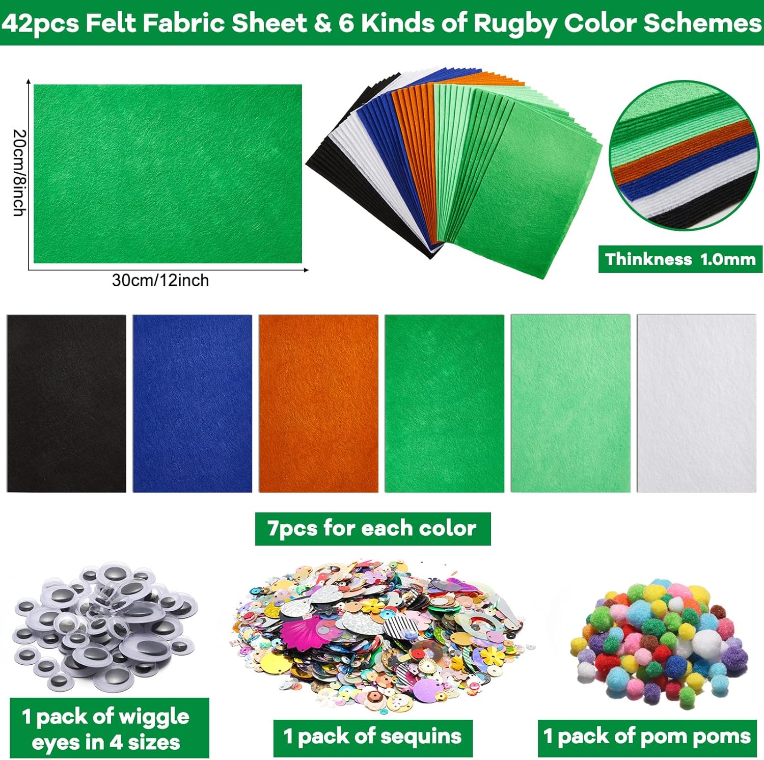 - Assorted Colors & Abundant Supplies: This set includes 42 high-quality felt fabric sheets in 6 rich shades: black, white, blue, brown, light green, dark green (20 x 30 cm / 8 x 12 inches). Each color comes with 7 sheets, and you’ll also get a bag of fun wiggle eyes, glitter, and pom poms. Whether you’re creating small accents or large projects, these soft felt fabric sheets provide endless possibilities for your DIY crafting needs.