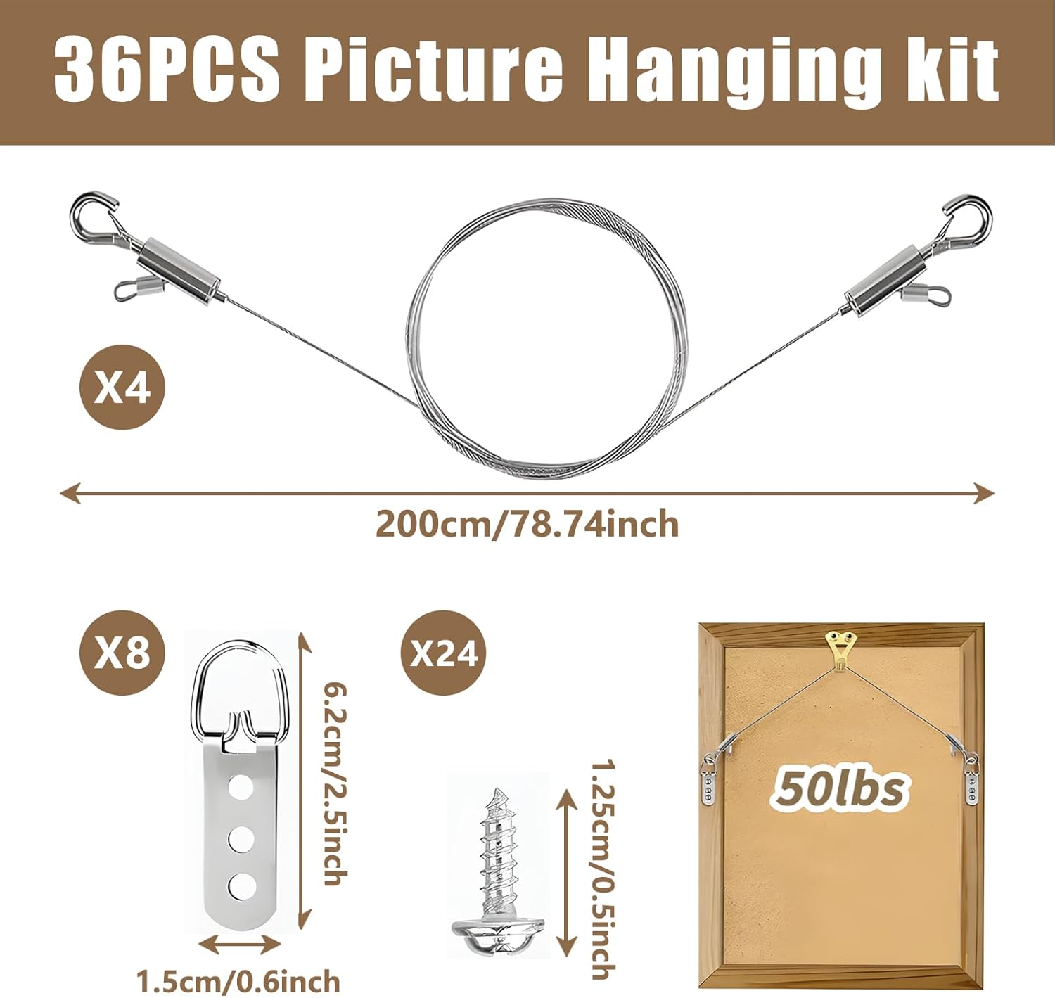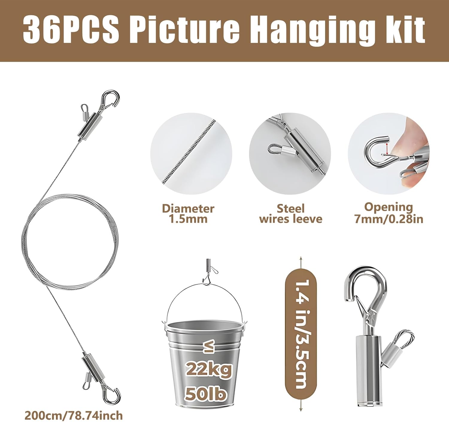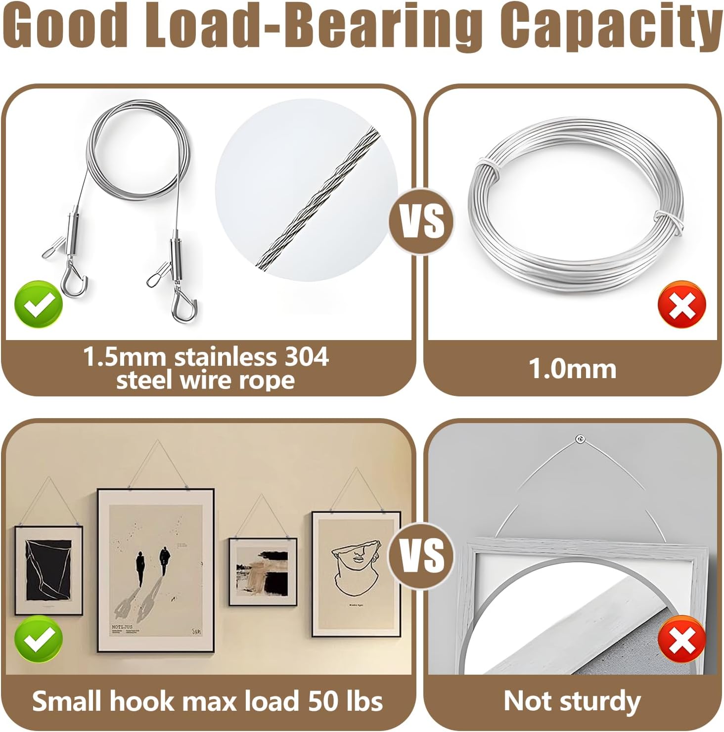 - Premium Quality Hanging Kit: The High-strength picture hanging wire constructed from high-quality iron with an anti-corrosion coating and ultra-smooth finish. Ensures long-lasting, safe use, and resists wear and tear for years