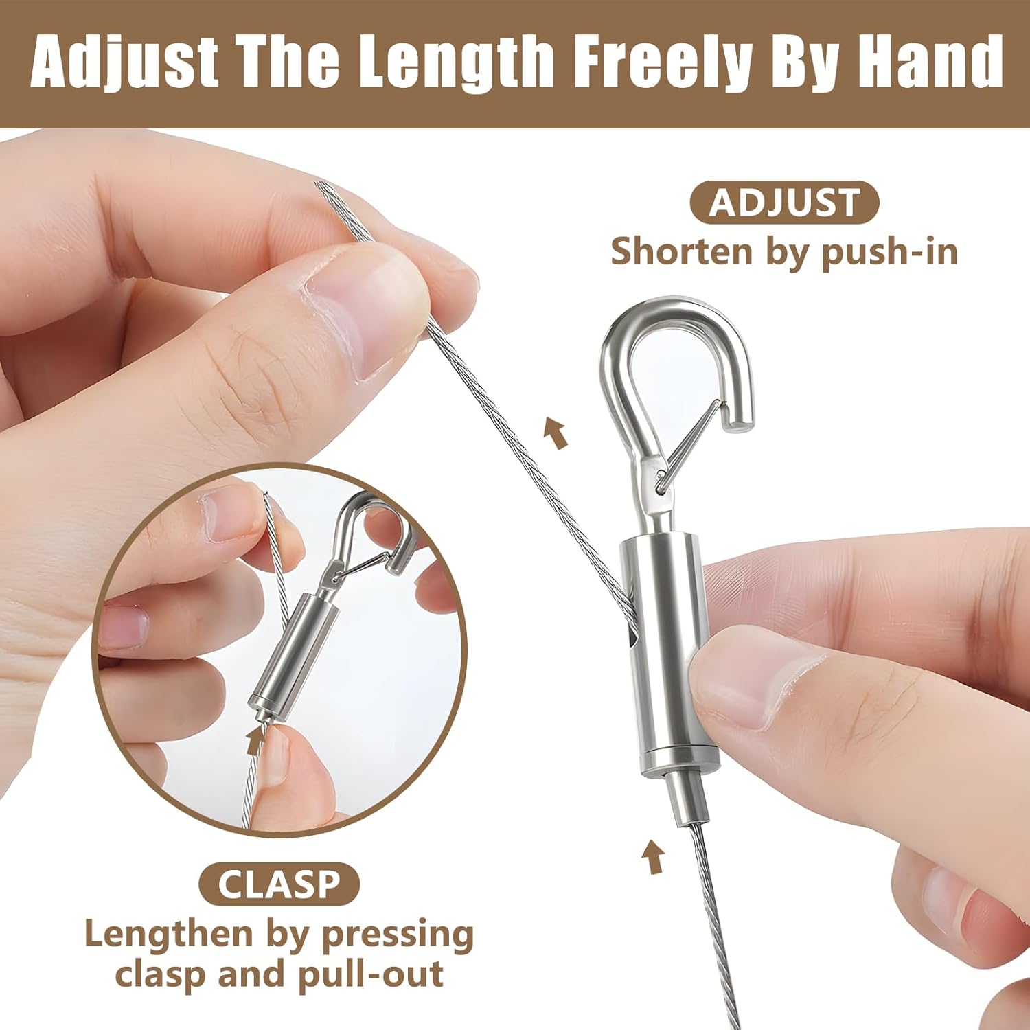 - Adjustable Length:The Picture Hanging Wire Features 2 pre-attached clips for hassle-free setupโno twisting, trimming, or complicated tools required. Simply hold down the adjusting column and drag the stainless steel wire rope to achieve the desired length, offering flexibility and convenience in your hanging projects