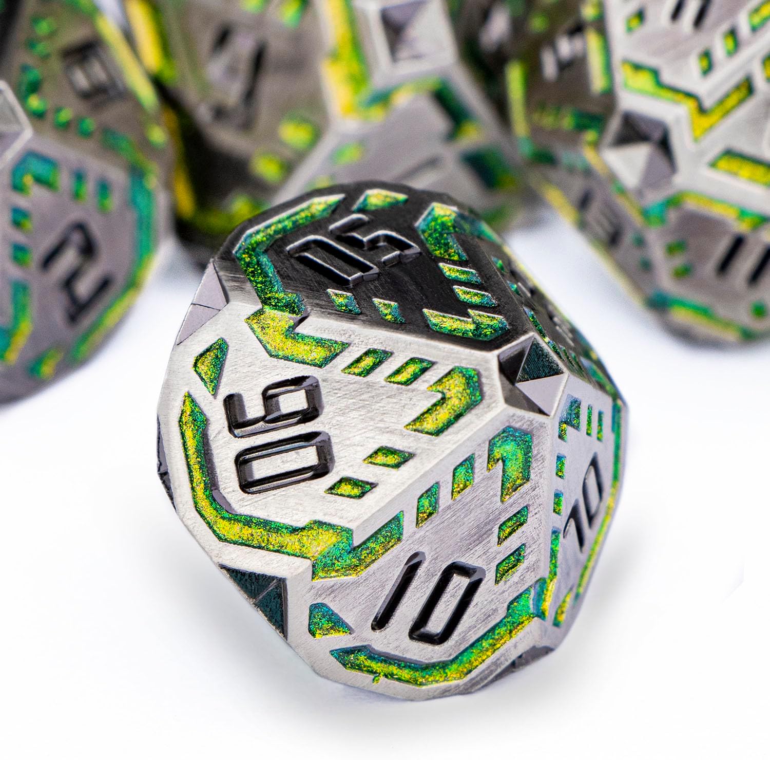 Metal DND Sci-fi Dice Set 7PCS Stripe Polyhedral Dice for Dungeons Dragons RPG Role Playing Game, Glitter D and D Dice with Gift Box D6 D8 D10 D12 D20 (Grey&Green Yellow)