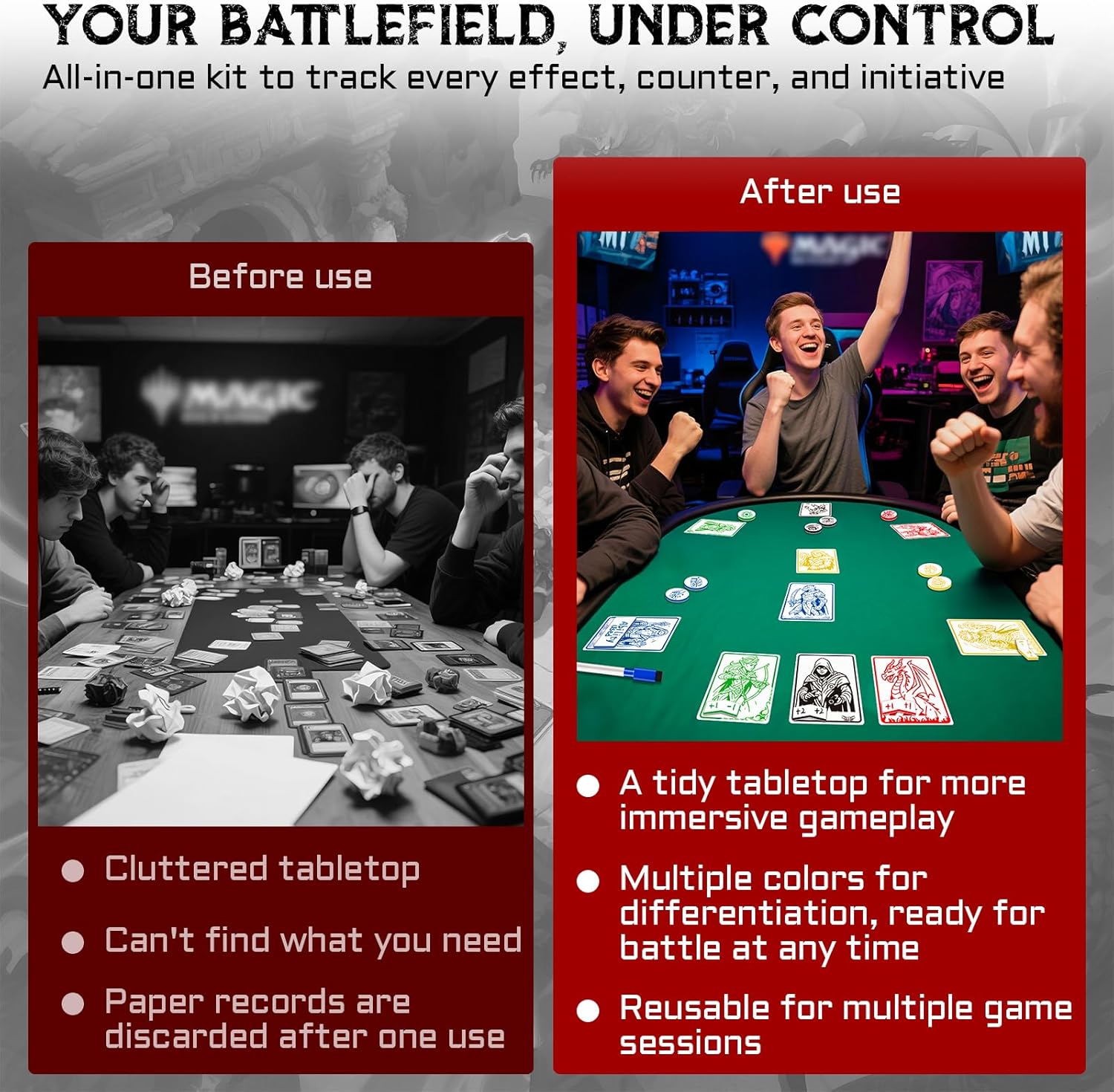 - ๐ฎ YOUR BATTLEFIELD, CRYSTAL CLEAR Color-code with 5 markers (green/black/red/blue/yellow): Use arrow tokens for enchantments, round counters for poison/+1/-1, and acrylic tags for commander damage. End board state confusion forever.