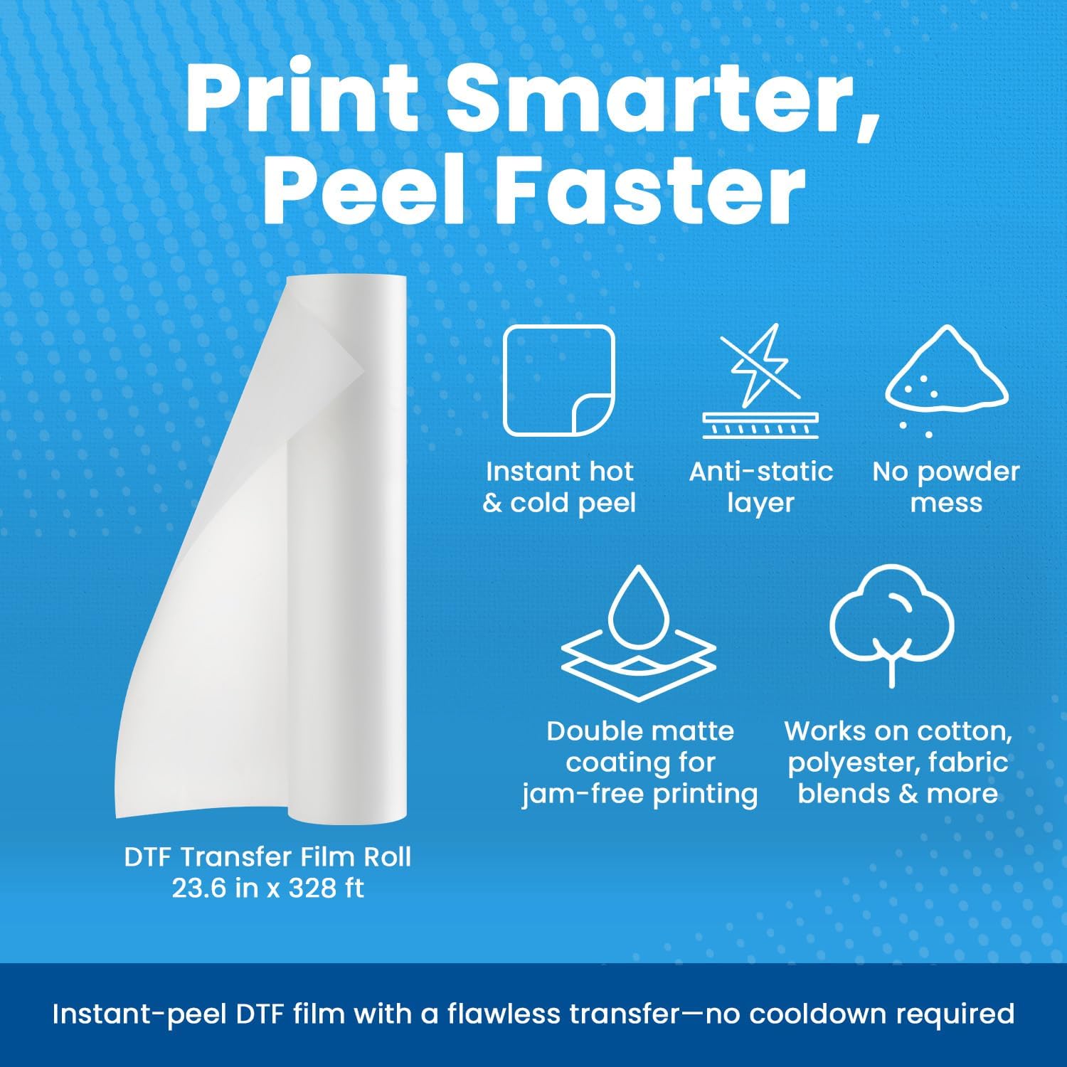 DTF Transfer Film Roll 23.6in x 328ft β Instant Hot & Cold Peel β Double Matte Anti-Static Coating β Premium Heat Transfer Film for Vibrant Colors & Durable Prints β Works with All DTF Printers