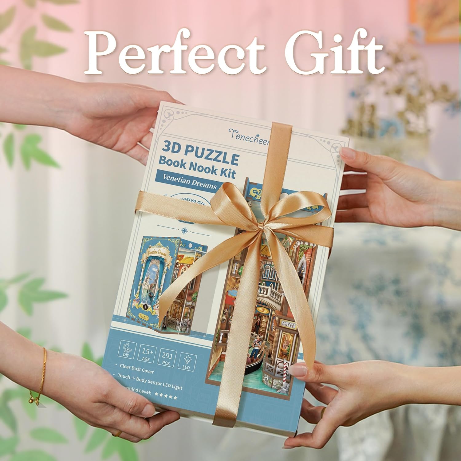 Tonecheer DIY Book Nook Kit for Adults, 3D Wooden Puzzle Bookend Miniature House Kit, Booknook Bookshelf Insert Decor with Dust Cover and LED Lights Gifts (Venetian Dreams)