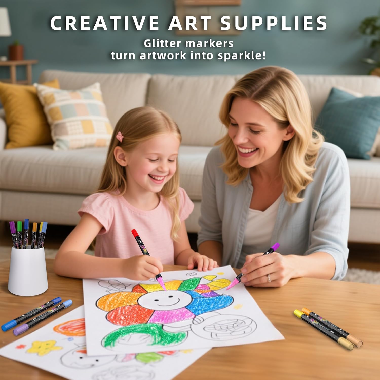 - 【Widely used and covered】:These dual glitter markers has a sparkle and attractive writing effect, suitable for casual creation and play.Moreover, these glitter pens works well on photos, card stock, rocks, plastic, mugs, fabric, metal, wood, ceramics, glass, and is especially effective on black or dark surfaces.These sparkle brush markers are so fun to apply to a variety of painting interfaces.