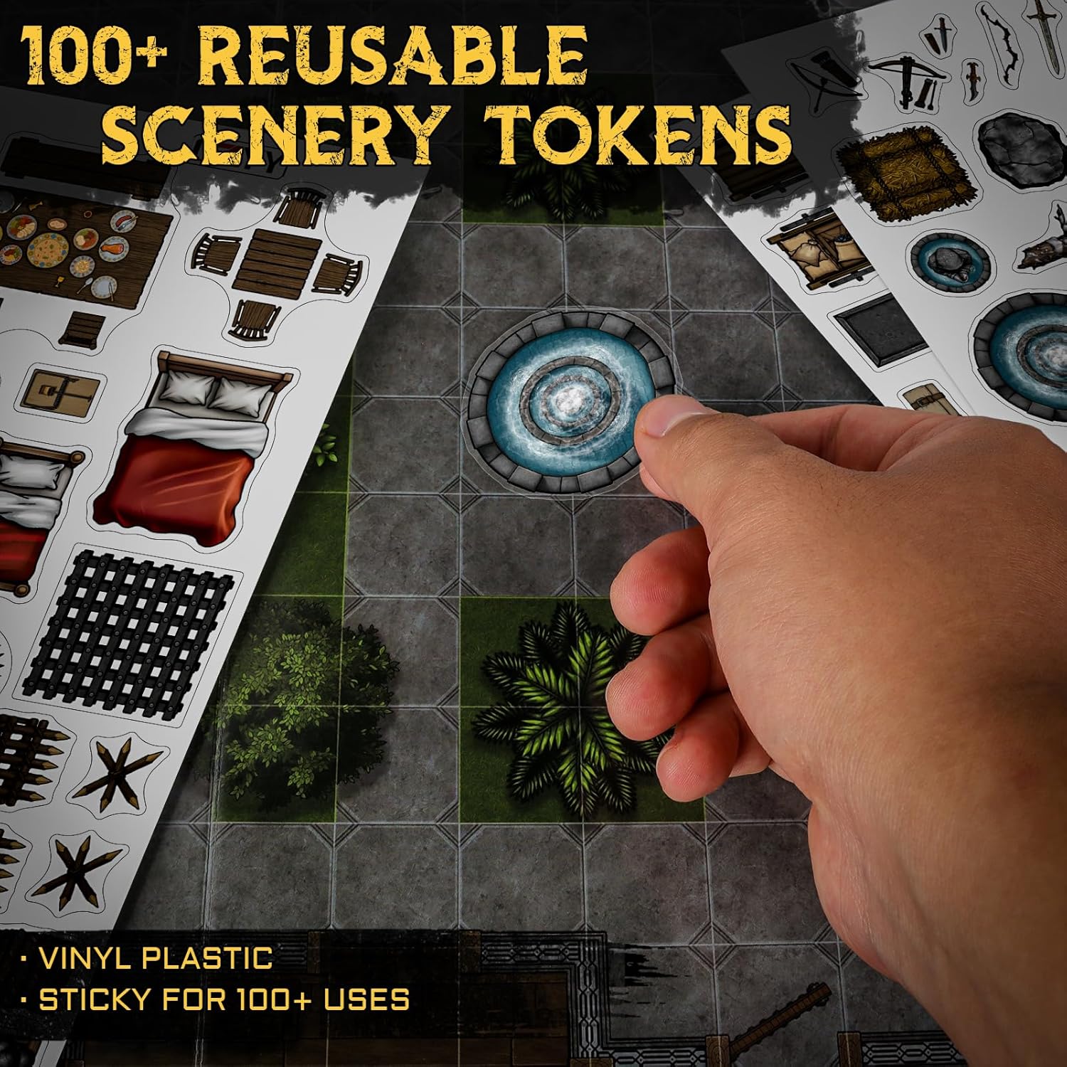 - 🎮 100+ REUSABLE SCENERY TOKENS FOR REAL-TIME TACTICS - Drop obstacles, treasure, or furniture with transparent, grid-scaled decals. Reposition mid-battle as your players burn bridges, collapse tunnels, or loot the tavern—no mess, no tearing.