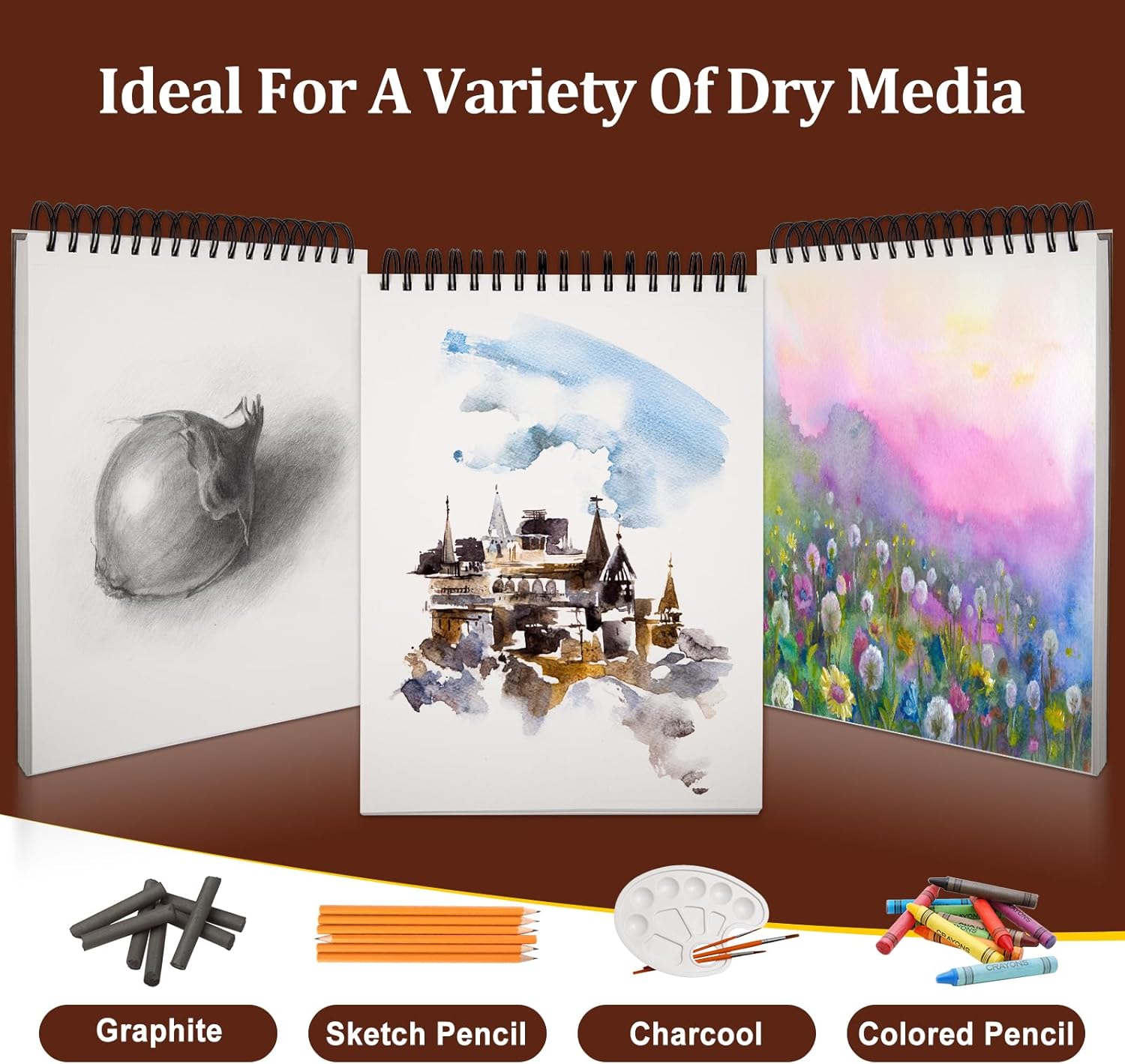 - 【Convenient Ring Binding Design】 The 5 pack sketch book set are spiral-bound , which can protect the paper when turning pages. Meanwhile, the drawing pad is flexible, can be rotated 360 degrees to maximize the sketching, drawing and writing space. Each page is micro-perforated, allows you to easily remove single page.