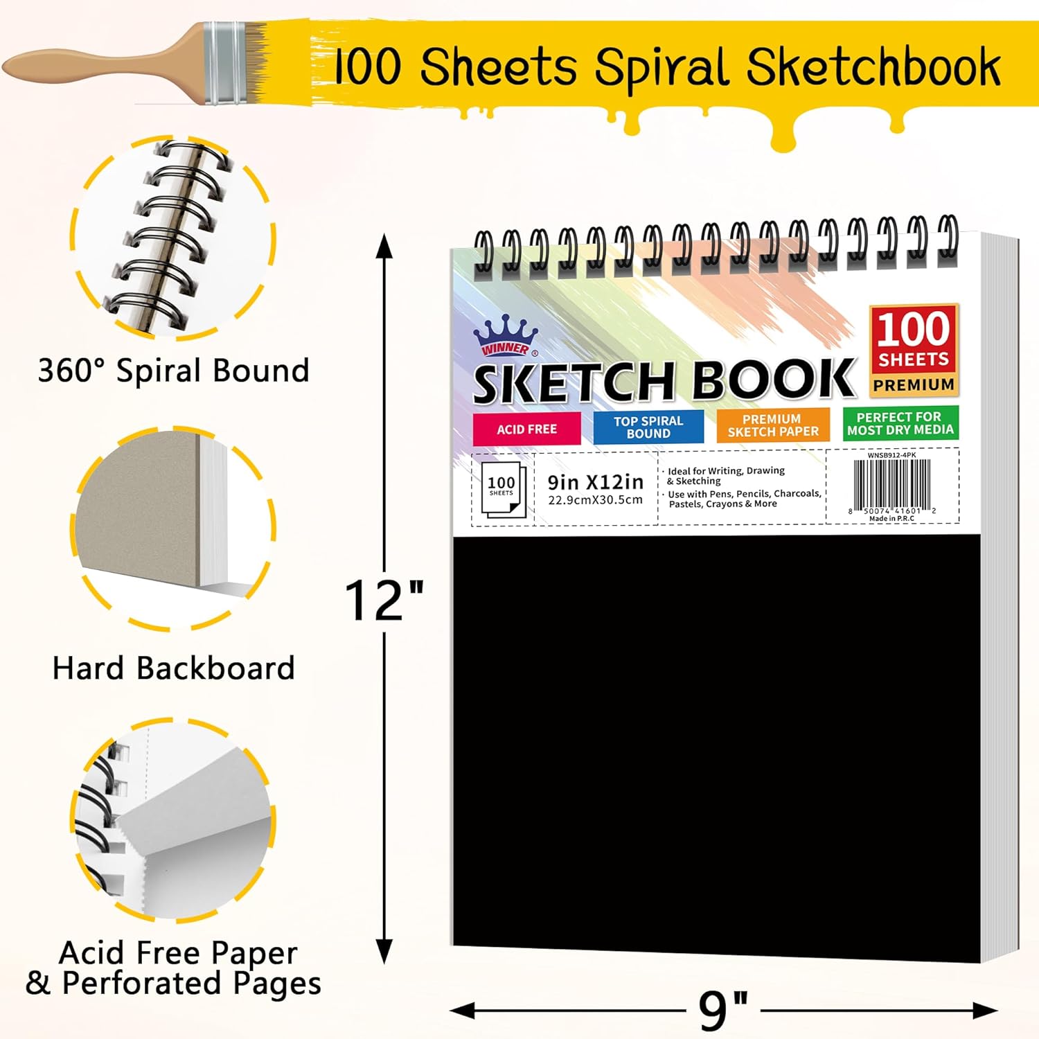 WINNER 9" x 12" Sketch Book 4 Pack, 400 Sheets Spiral Bound Art Sketchbook, 68lb/100gsm White Acid Free Drawing Pad, Painting Drawing Writing Sketch Pad, Art Supplies for School, Kids, Adults &Teens