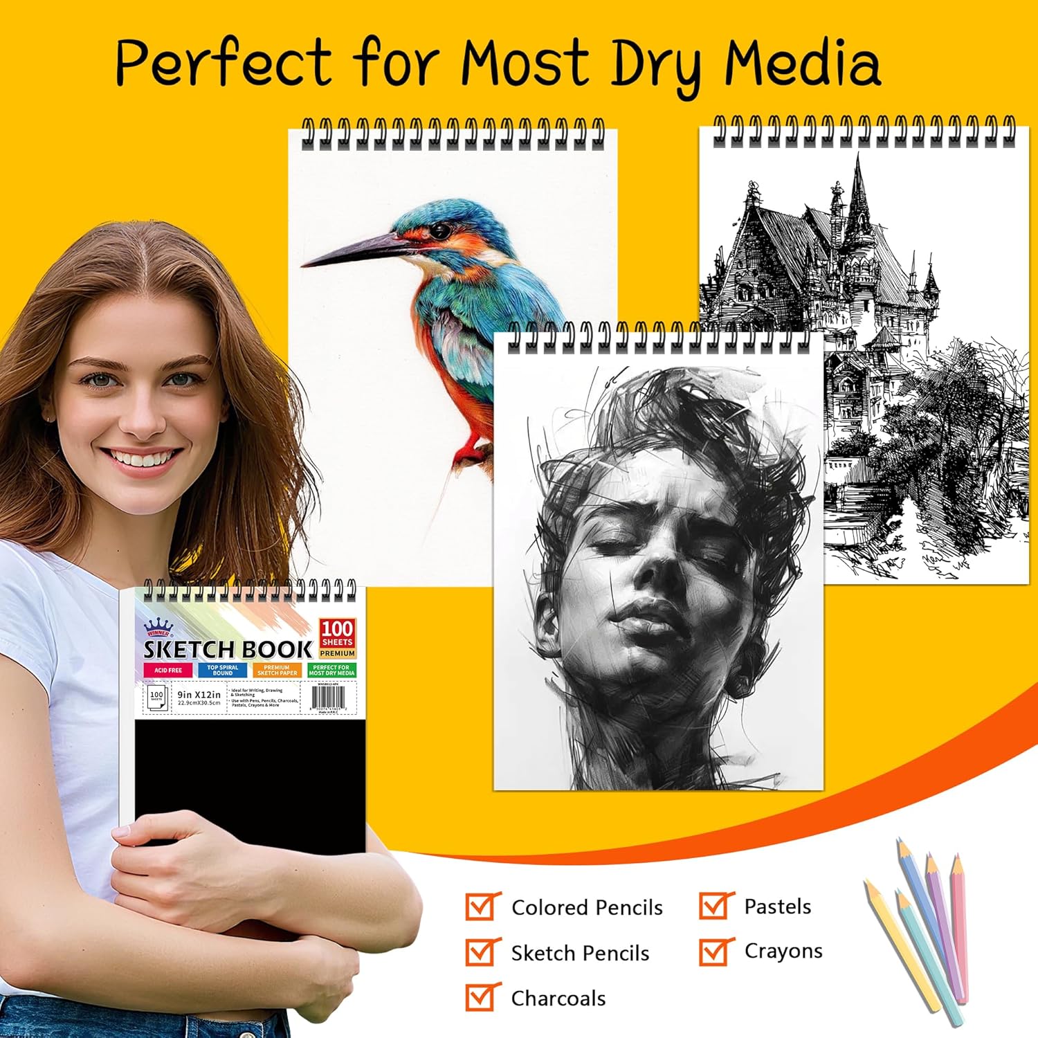 - Premium Art Drawing Paper: Our sketchbook is crafted from premium 68 lb/100 gsm acid-free paper, offering unparalleled durability and artwork preservation. Each pad contains 100 sheets measuring 9 x 12 inches and features a sturdy hardback cover and solid backing board. The paper can withstand repeated erasing and reworking without becoming damaged.The thick, finely textured surface resists bleeding, smudging and feathering, ensuring your artwork remains crisp and vibrant for years to come.