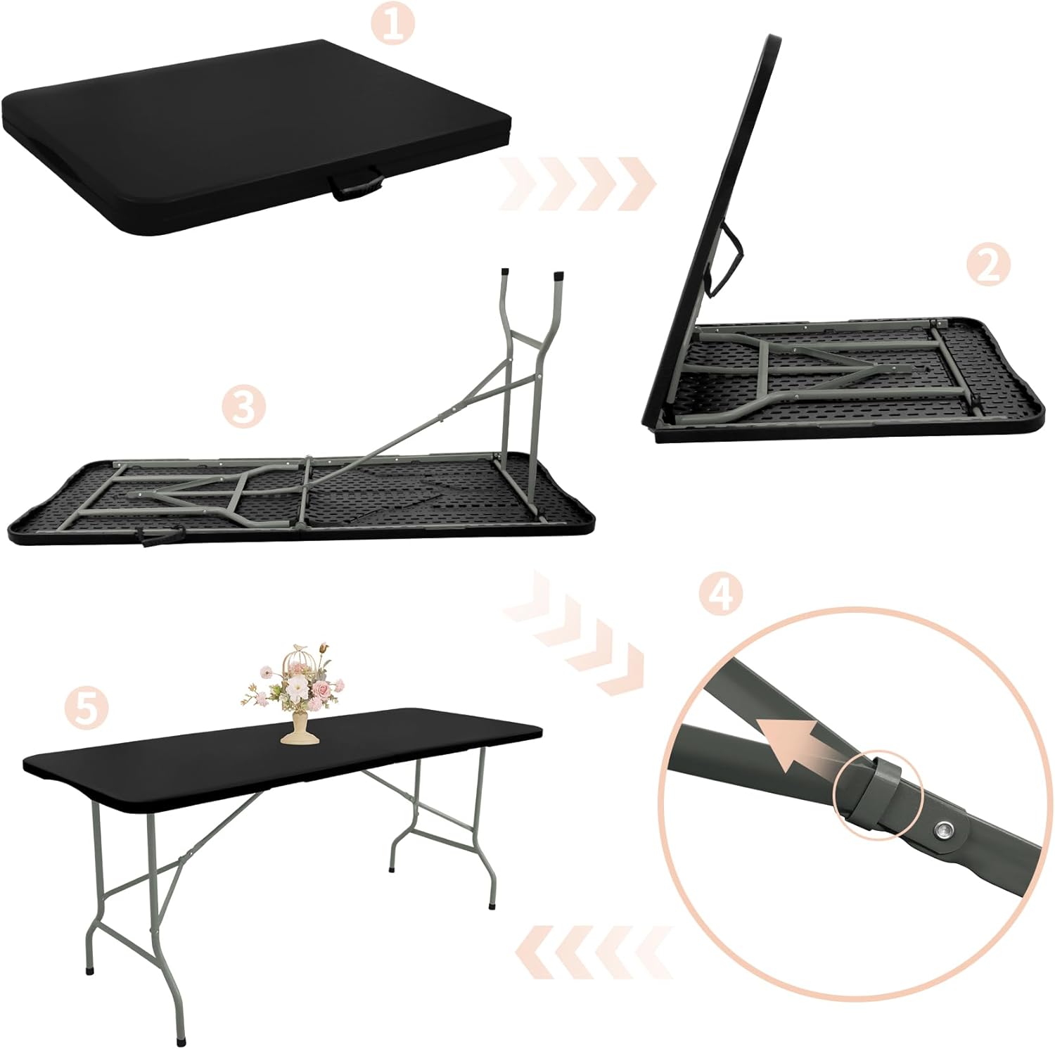 Folding Table 5FT Camping Table Portable Heavy Duty Plastic Rectangular Outdoor Dining Table Steel Legs Fold-in-Half with Carrying Handle for Indoor,Picnic,Party,Wedding,Events(Black)