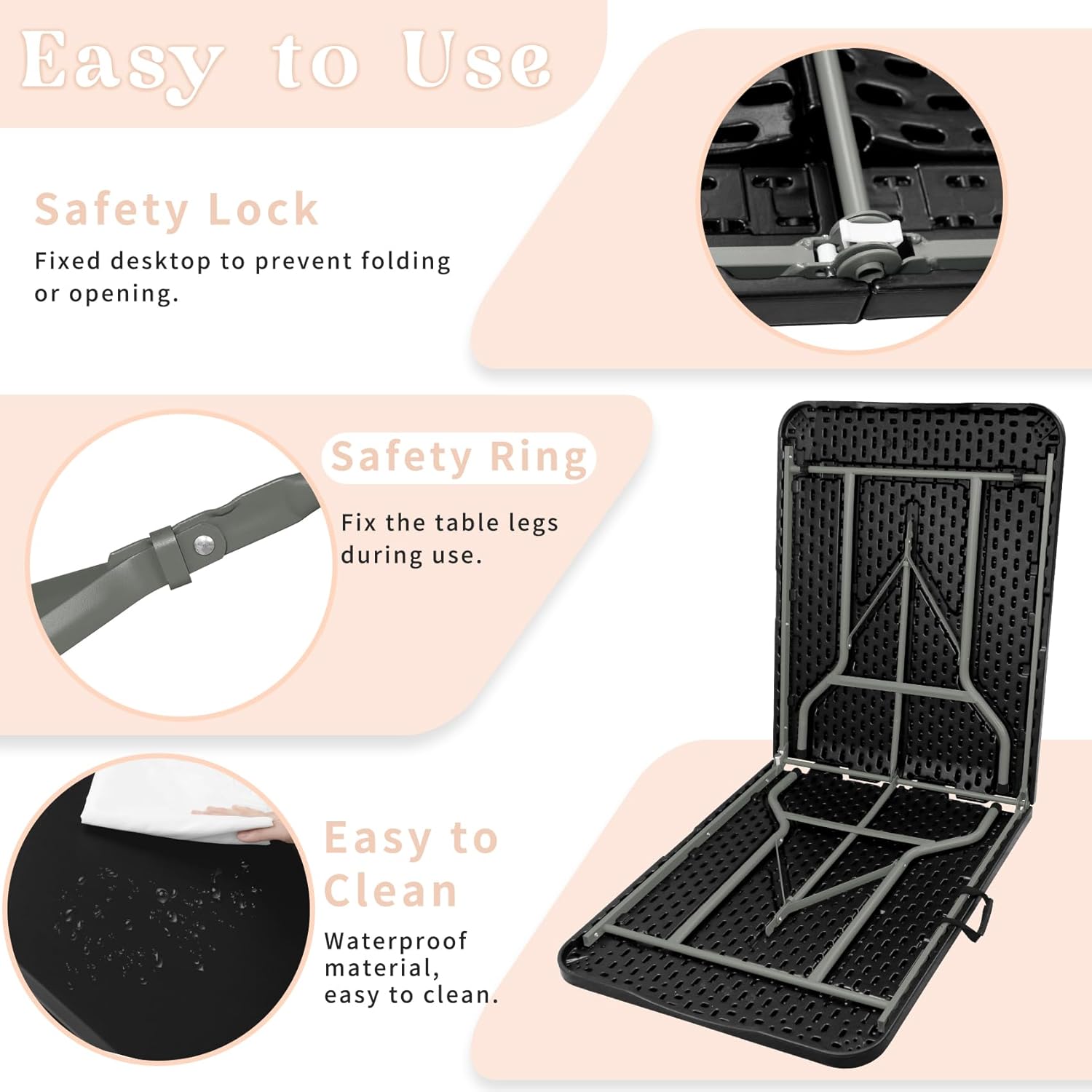 - Multi Functional Outdoor Table:The surface of this folding table is smooth and sturdy, easy to wipe, and the table corners are designed with rounded corners for safety and reliability. The anti slip covers on the four table legs prevent the table from shaking freely and protect the floor from scratches. Each table can accommodate 2-6 people, making it the best choice for outdoor camping, indoor activities, picnics, offices, birthday parties, banquets, weddings, craft fairs, kitchen table, and other events.