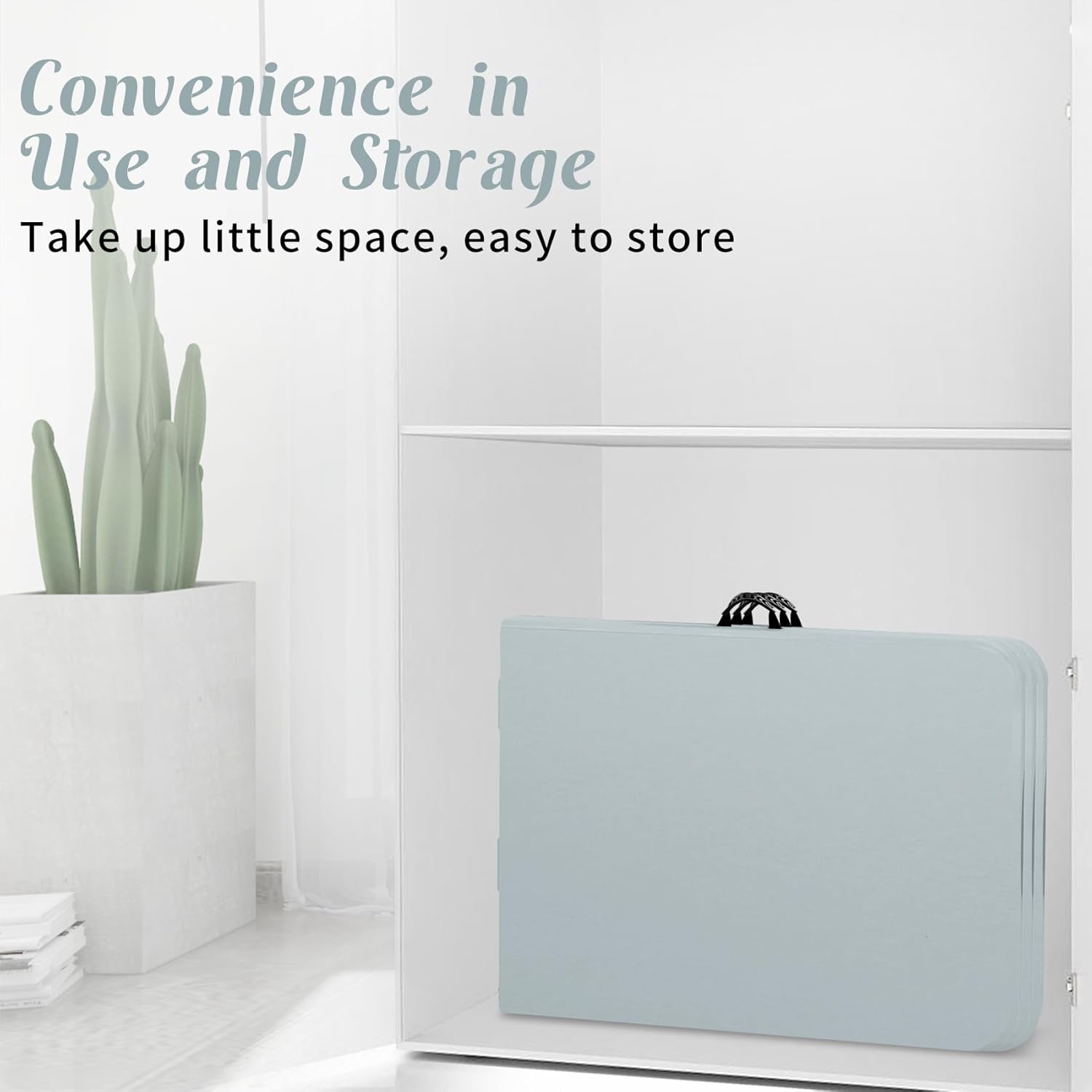 - Foldable and Portable Design: The 6 FT folding table can be conveniently folded in half and secured with a safety buckle. Only half of the tabletop area after folding that saves your storage space, making it easy for storing in your car trunk. It features a portable handle, lightweight tabletop and frame, makes it easy to carry by one person after folding.